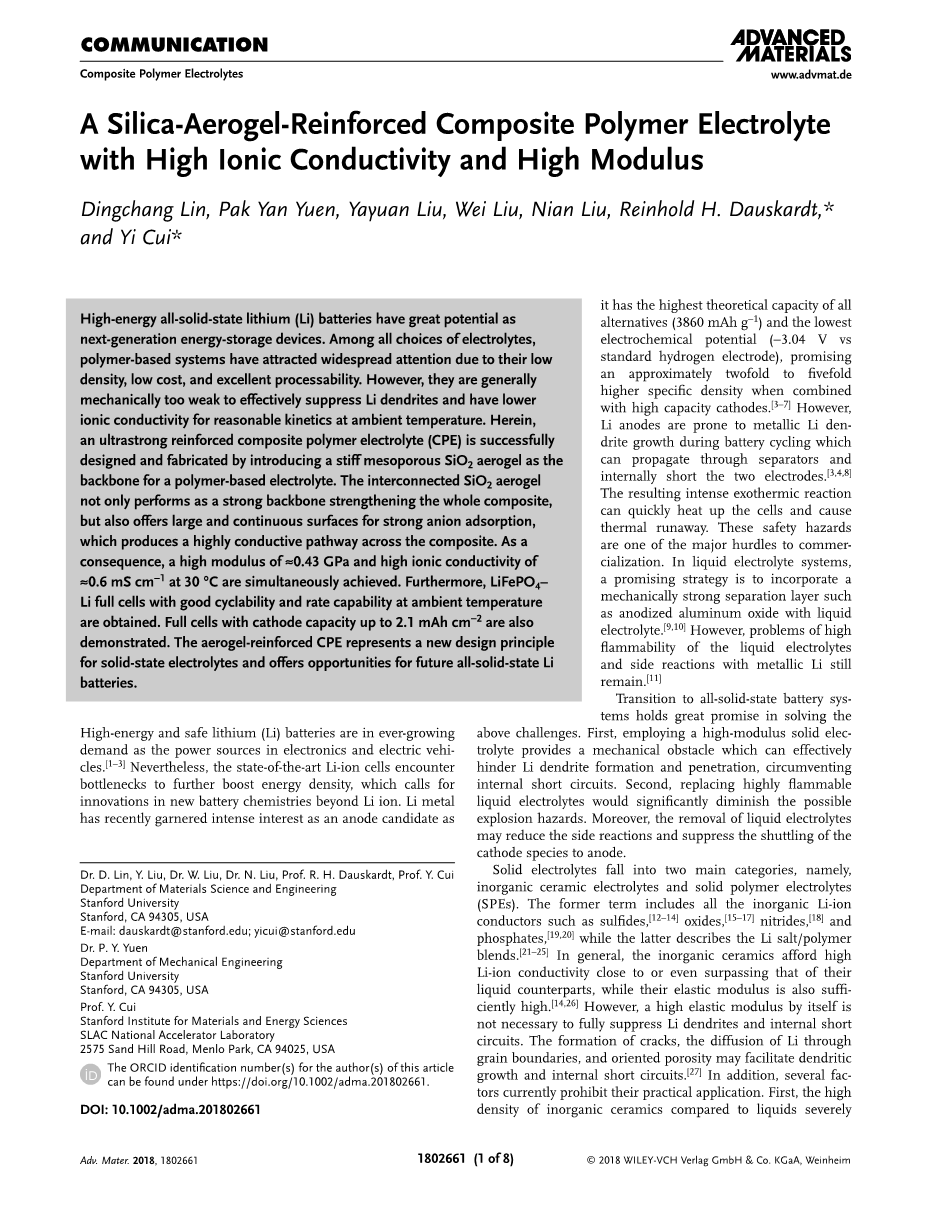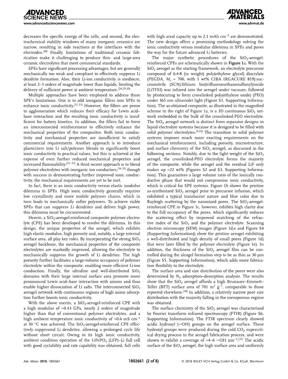 利用以上优点,SiO2气凝胶增强复合聚合物电解质(CPE)实现了约0.43GPa的高模量,比传统聚合物电解质高近2个数量级,并且在30℃的环境温度时,离子电导率大约高达0.6mS·cm-1。SiO2气凝胶增强复合聚合物电解质(CPE)有效地抑制了锂枝晶,延长循环寿命而没有产生短路。由于其高离子电导率,制得了具有良好循环性和倍率性能的LiFePO4(LFP)-Li全电池,证明了全电池的面积容量高达2.1mAh·cm-2。这种新的设计为解决SPEs中离子电导率与模量相矛盾提供了一种有前景的方案,为未来先进的锂电池的发展铺平了道路。