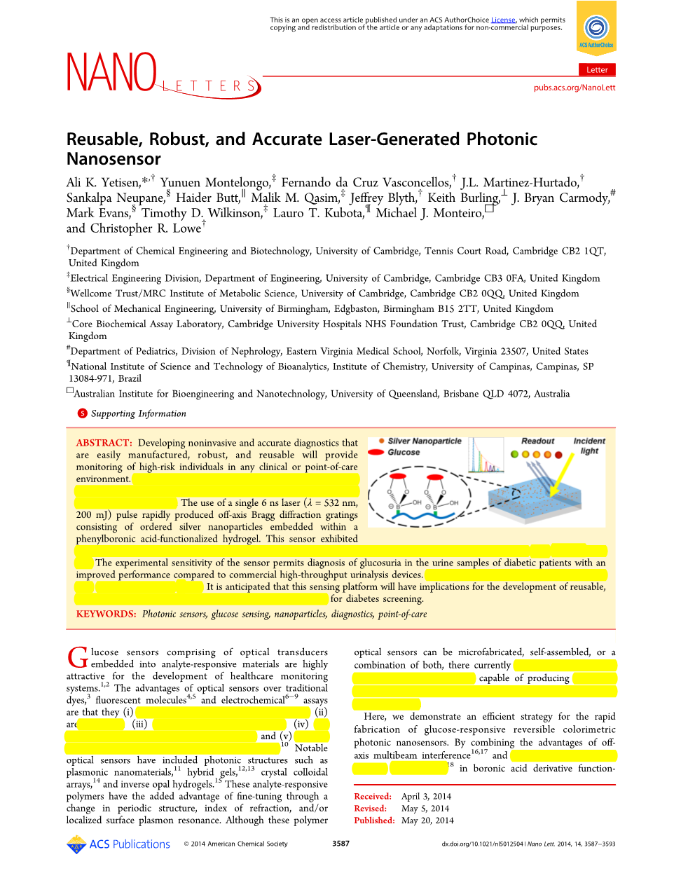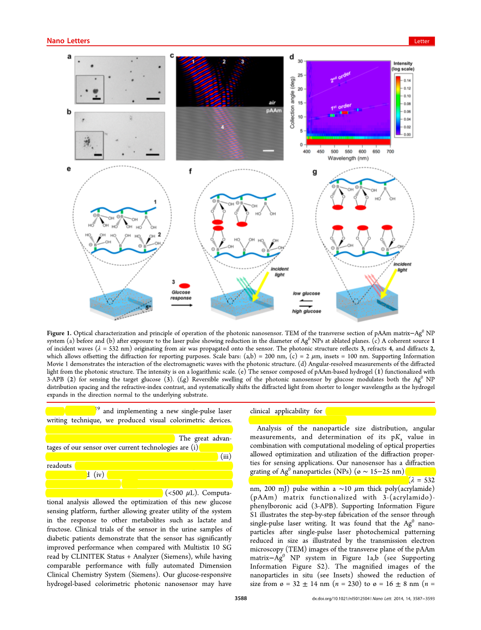 在文中,我们给出了一种快速制备葡萄糖响应可逆比色光子纳米传感器的有效方法。我们结合离轴多光束干涉和硼酸衍生物功能化水凝胶中金属纳米粒子的原位尺寸缩小的优点,采用新的单脉冲激光刻写技术,制作了视觉比色仪。采用分光光度法实现了全定量窄带(单色)读出。目前,我们的传感器技术的优势是:(1)可重复使用,(2) 通过激光技术进行批量生产,(3) 在光谱的可见光和近红外区域读取数据,(4) 使用低样品体积(lt;500mu;L),在0.1-375.0 mM的葡萄糖浓度范围内进行检测,具有可重复性和高分析灵敏度。计算分析使这个新的葡萄糖传感平台得到了优化,并进一步允许系统在响应其他代谢产物如乳酸和果糖时发挥更大的效用。该传感器在糖尿病患者尿液样本中的临床试验表明,与CLINITEK Status Analyzer (西门子)读取的Multistix 10 SG相比,该传感器的性能有了显著提高,同时与全自动Dimension临床化学系统(西门子)的性能相当。我们研制的葡萄糖响应性凝胶型比色光子纳米传感器可用于糖尿病的筛查或细菌性尿路感染的诊断。