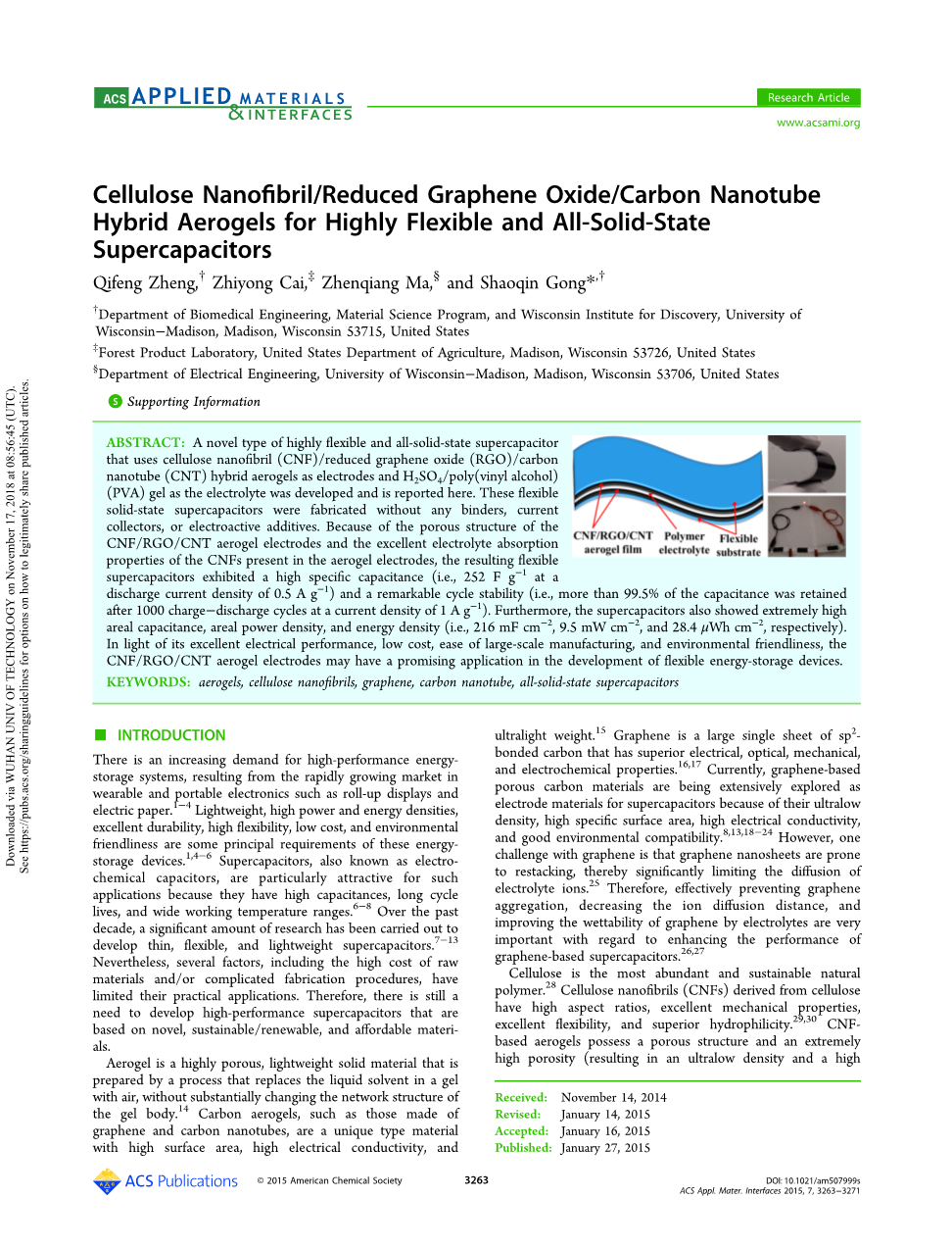 纤维素纳米纤丝/还原氧化石墨烯/碳纳米管混合气凝胶,用于高柔性的全固态超级电容器