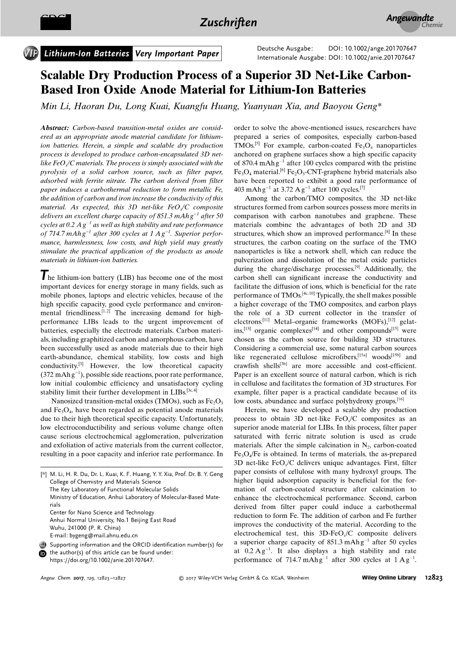 摘要:碳基过渡金属氧化物被认为是一种合适的锂离子电池负极材料。在此,开发了一种简单且可伸缩的干法生产工艺,通过高温分解吸附有硝酸铁的固体碳源(例如滤纸),以生产碳包覆的3D网状FeOx/C材料。滤纸中的碳引发碳热还原制备金属铁,碳和铁的添加增加了该材料的导电性。正如预期的那样,这种3D网状FeOx/C复合材料在0.2Ag-1,50次循环后提供了851.3mAhg-1优异的充电容量,在1Ag-1,300次循环后具有714.7mAhg-1的高稳定性和倍率性,该材料性能优异,无害,低成本,高产率有助于产品在锂离子电池中作为负极材料的应用。