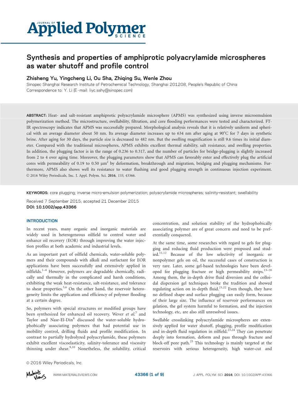 在本文中,为了开发一种耐高温耐高盐度油藏的堵水和调剖剂,我们通过反相微乳液聚合设计合成了一种具有侧链芳香环、阴离子和阳离子基团的耐热耐盐聚丙烯酰胺微球。同时,研究了微球结构和溶胀行为,并与传统的聚合物微球进行了比较。还评估了老化时间对膜过滤的影响和微球的岩心堵塞性能,以便聚丙烯酰胺微球能有长期的有效应用。