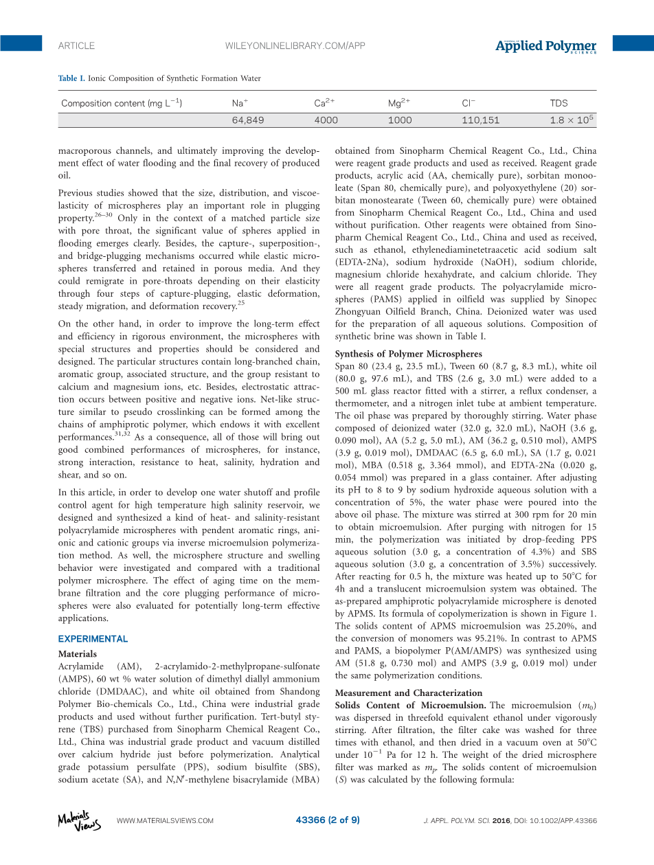 丙烯酰胺(AM),2-丙烯酰胺基-2-甲基丙烷磺酸盐(AMPS),二甲基二烯丙基氯化铵(DMDAAC)的60%质量分数水溶液和从中国山东聚合物生物化学品有限公司获得的白油是工业级产品,无需进一步纯化即可使用。购自中国国药化学试剂有限公司的叔丁基苯乙烯(TBS)是工业级产品,需在聚合之前在氢化钙上真空蒸馏。从中国国药化学试剂有限公司获得的分析级过硫酸钾(PPS),亚硫酸氢钠(SBS),醋酸钠(SA)和N,N #39; - 亚甲基双丙烯酰胺(MBA)是试剂级产品并按原样使用。试剂级产品,丙烯酸(AA,化学纯),脱水山梨糖醇单油酸酯(Span 80,化学纯)和聚氧乙烯(20)脱水山梨糖醇单硬脂酸酯(Tween 60,化学纯)得自中国国药化学试剂有限公司,并且不经纯化可使用。其他试剂从中国国药化学试剂有限公司获得,并按原样使用,如乙醇,乙二胺四乙酸钠盐(EDTA-2Na),氢氧化钠(NaOH),氯化钠,氯化镁六水合物和氯化钙。它们都是试剂级产品。应用于油田的聚丙烯酰胺微球(PAMS)由中国石化中原油田分公司提供。去离子水用于制备所有水溶液。合成盐水的组成如表I所示。