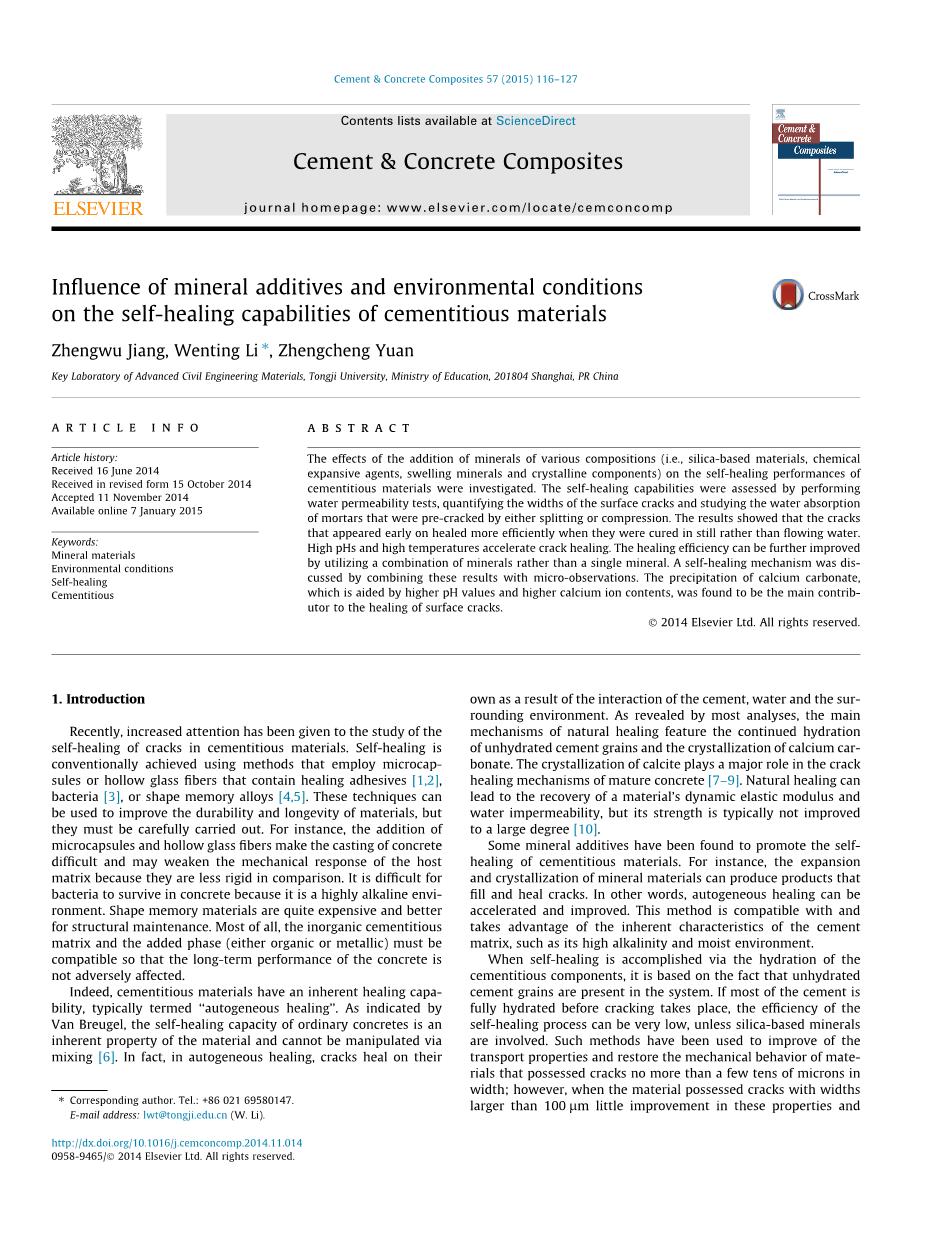 关键词: 矿物材料、环境条件、自愈合、水泥基材料