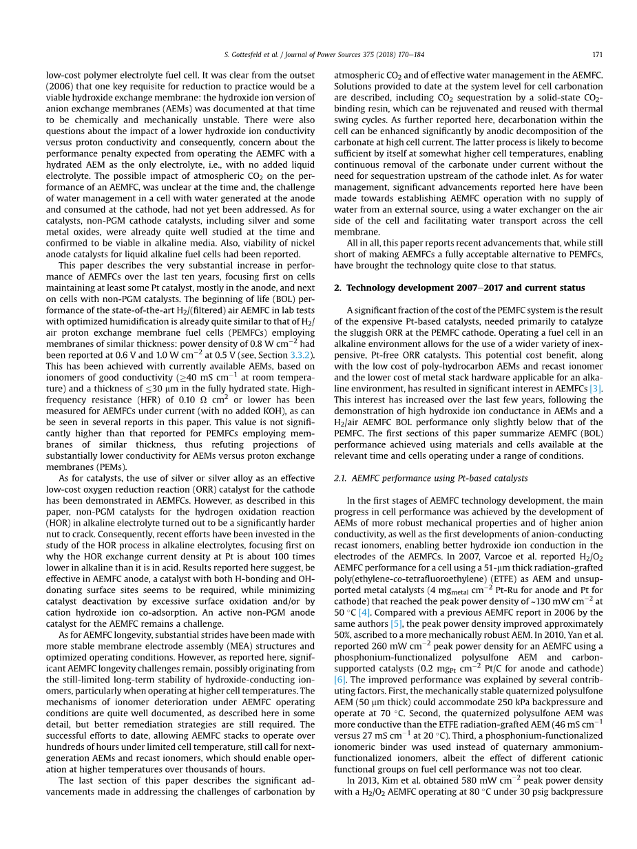 这篇文章描述了近十年来AEMFCs性能的显著提高,首先关注的是主要在阳极上保留了一些Pt催化剂的电池,然后是使用非铂族金属催化剂的电池。最先进的H2 /(过滤)空气AEMFC在最佳加湿空气氛围的实验室测试下BOL性能已经很近似于采用类似的膜厚度的H2 /空气质子交换膜燃料电池。这是通过现有的AEMs实现的,它基于导电性良好的离子和完全水化状态下厚度小于等于30微米的离子。在电流(不添加KOH)的作用下,AEMFCs的高频电阻(HFR)为0.10 Omega; cm2或更低,从本文的几篇报道中可以得出。这一数值并不明显高于使用类似厚度膜的PEMFCs,因此反驳了AEMs相对于质子交换膜(PEMs)电导率低得多的预测。