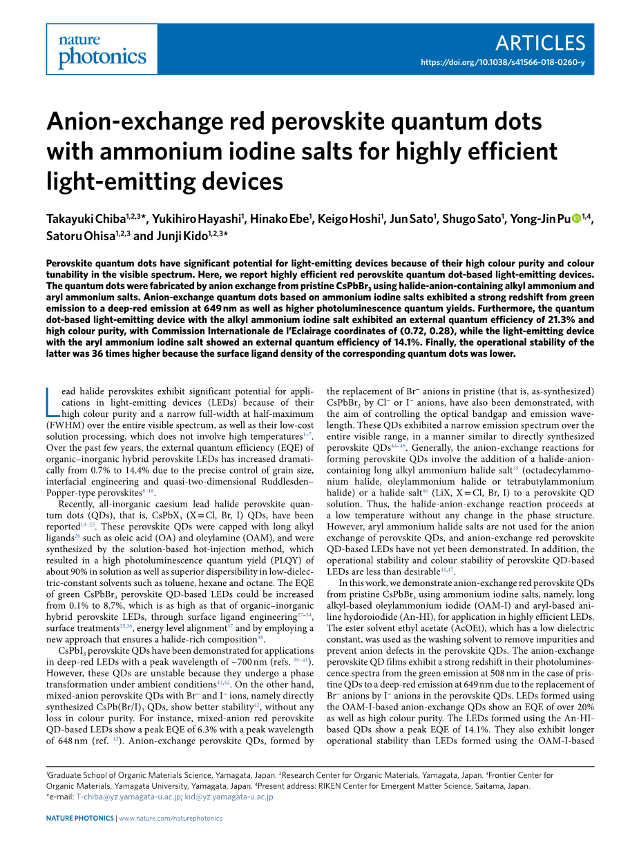 铅卤化物在发光器件(LEDs)中具有很大的应用潜力,因为它们具有高色纯度,在整个可见光谱范围内具有窄半峰宽(FWHM),以及不涉及高温的低成本的溶液法制备1-7。在过去的几年中,由于晶粒尺寸、界面工程和准二维Ruddlesden-Popper-type钙钛矿的精确控制,有机-无机杂化钙钛矿LEDs的外量子效率(EQE)从0.7%急剧增加到14.4%8-18。