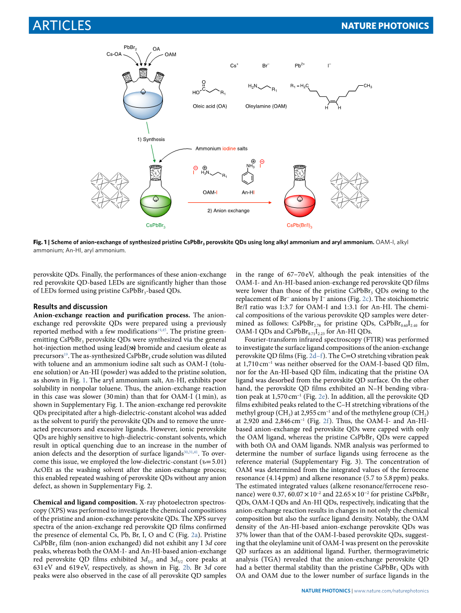 阴离子交换反应和纯化过程。使用先前报道的方法制备阴离子交换红钙钛矿QD,并进行一些修改19,45。原始绿色CsPbBr3钙钛矿QDs使用溴化铅(Ⅱ)和油酸铯作为前体19通过一般的热注入方法合成。随后,将合成的CsPbBr3粗溶液用甲苯稀释,并将碘铵盐如OAM-1(甲苯溶液)或An-HI(粉末)加入到原始溶液中,如图1所示。芳基铵盐,An-HI,在非极性甲苯中的溶解性差,因此,在这种情况下,阴离子交换反应比OAM-I(1分钟)慢(30分钟),如补充图1所示。在合成阴离子交换红色钙钛矿后,加入高介电常数醇作为溶剂以纯化钙钛矿QD并除去未反应的前体和过量配体。然而,离子型钙钛矿QD对高介电常数溶剂高度敏感,由于阴离子缺陷数量的增加和表面配体的解吸,导致光学猝灭30,31,41。为了克服这个问题,我们采用低介电常数(ε= 5.01)AcOEt作为阴离子交换过程后的洗涤溶剂,这能够重复洗涤钙钛矿QD而没有任何阴离子缺陷,如补充图2所示。