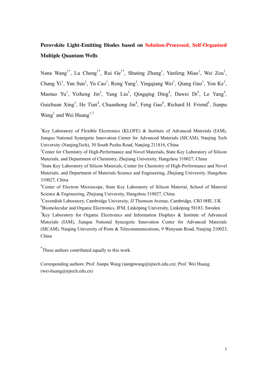 三维钙钛矿实际上是层状有机卤化物钙钛矿的极端情况,其通式为L2(SMX3)n-1MX4,,其中M、X、L和S分别是二价金属阳离子、卤化物、具有长链有机阳离子和具有短链有机阳离子。这里n是两个有机绝缘层(阳离子L)中的半导体MX4单层片数,n=infin;对应于三维钙钛矿SMX3的结构。随着MX4层数的减少,量子限制效应的作用越来越明显,如能隙和激子能都会增大,因此,层状钙钛矿自然会形成量子阱结构。另一个极端是:当n=1时,层状钙钛矿会形成二维(2D)钙钛矿L2MX4的单层结构。二维L2MX4钙钛矿通常具有良好的成膜性能。然而因为激子猝灭速度过快,会导致在室温下二维钙钛矿的PLQE很低。二维钙钛矿的发光二极管已经被研究过,且存在器件效率很差以及只能在低温温度下测量等缺点。因此在这里我们结合了二维和三维钙钛矿二者的优势,证明了基于溶液法制备的具有多能级结构的钙钛矿多量子阱(MQWs),在室温下就可以实现非常高效、高亮度的电致发光。