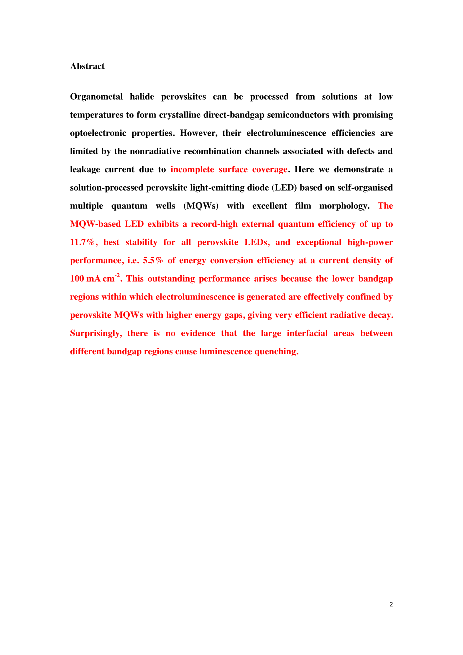 摘要:有机卤化物钙钛矿可以利用低温溶液法进行加工,形成具有良好光电性能的晶体直接带隙半导体。然而,由于薄膜表面覆盖不完全,从而导致电致发光效率会受到缺陷和漏电流等非辐射复合通道的限制。本文中制备了一种具有良好薄膜形貌的、基于溶液法制备的自组装多量子阱(MQWs)钙钛矿发光二极管(LED)。MQWs LED的外量子效率高达11.7%,在所有钙钛矿型发光二极管中它的稳定性是最好的,同时它还具有高功率下的优异性能:当电流密度为100 mA cm-2时,能量转换效率为5.5%。之所以能产生这种优异的性能,是因为产生电致发光的低禁带区受到具有较高能隙的钙钛矿的多量子阱的有效限制,产生非常有效的辐射衰变。令人惊讶的是,没有证据表明不同带隙区之间的大的界面面积会导致发光淬灭。