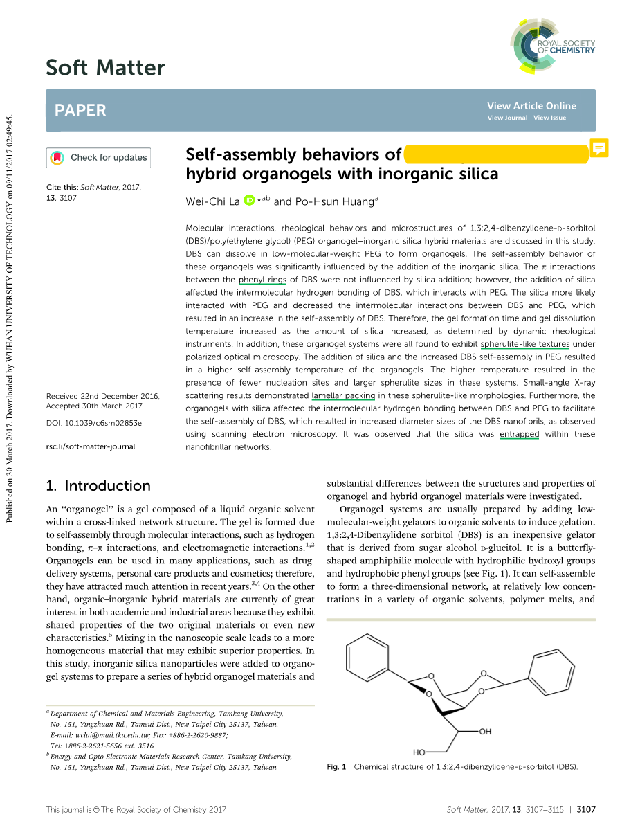 研究讨论的是DBS/PEG有机凝胶和无机硅混合材料的分子间相互作用、流变行为及微观结构。DBS可以在低分子量的PEG中溶解形成有机凝胶,这些有机凝胶的自组装行为受无机硅的影响,而DBS中苯环上的大pi;键并不受二氧化硅的影响,但却会影响DBS与PEG之间氢键作用力。二氧化硅更有可能与PEG相互作用,使DBS与PEG之间的相互作用减少,导致DBS自组装增加。因此,凝胶形成的时间和凝胶溶解的温度随着二氧化硅含量的增加而增加,这些可由动态流变仪器测得。此外,这些有机凝胶体系在偏振光显微镜下均表现出类似球粒的结构。在聚乙二醇中加入二氧化硅和DBS自组装量的增加使得有机凝胶的自组装温度升高,温度越高,成核点越少,球粒尺寸越大。小角X射线证明在这些球状形态层中有层状填料,此外,含二氧化硅的有机凝胶影响了DBS和PEG之间的分子间氢键,从而促进了DBS的自组装,这导致了扫描电镜观察到的DBS纳米纤维的直径尺寸增大,可观察到二氧化硅被包裹在这些纳米纤维网络中。