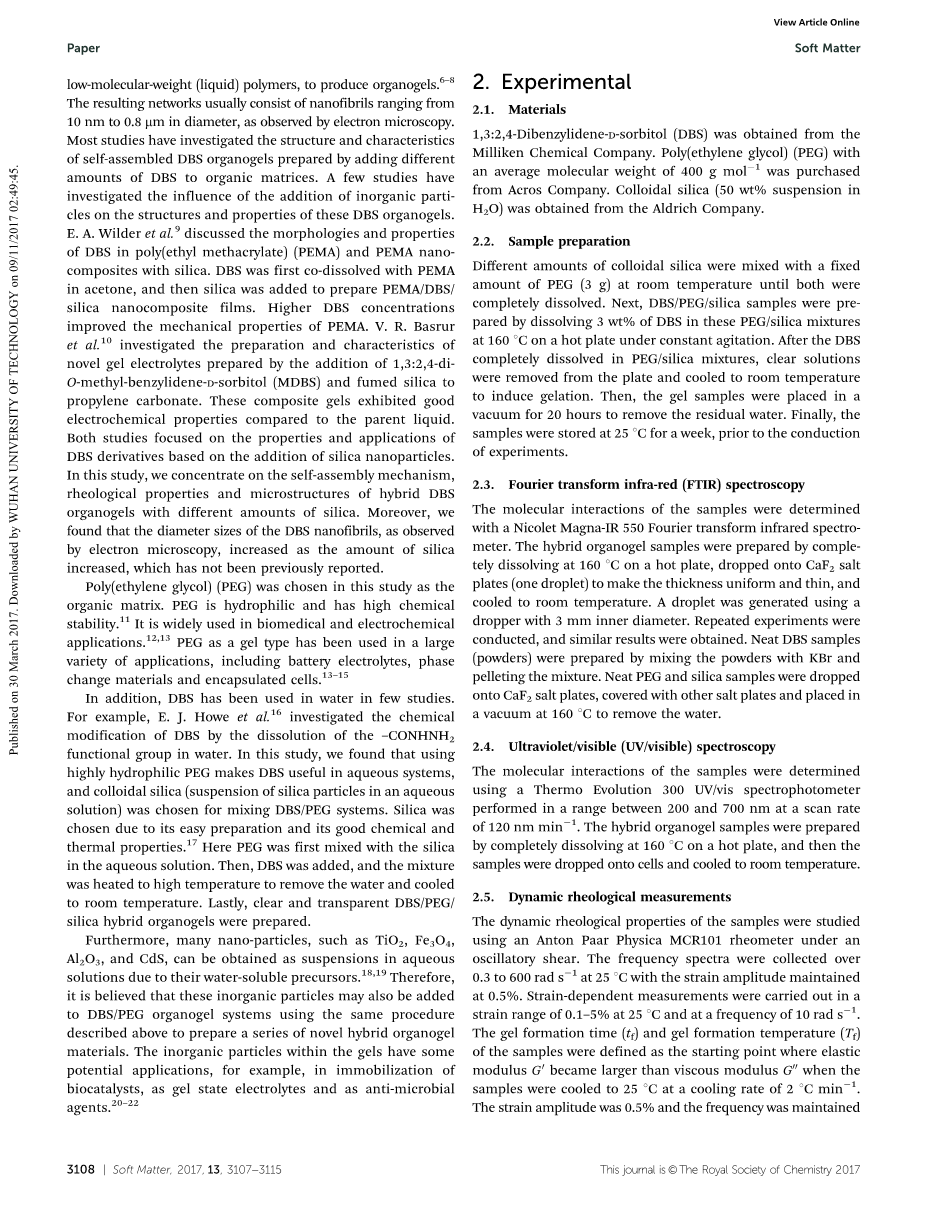 将不同量的胶态二氧化硅与一定量的PEG (3g)在室温下混合,直至两者完全溶解。接下来,在160℃的高温下,将3%的DBS溶于PEG/二氧化硅混合物中,在恒定的搅拌速度下,在热板上制备DBS/PEG/二氧化硅样品。DBS在PEG/二氧化硅混合物中完全溶解后,从平板中取出透明溶液,冷却至室温,诱导凝胶化。然后将凝胶样品置于真空中20小时,去除残留水分。最后,将样品在25℃的温度下保存一周,然后进行实验。