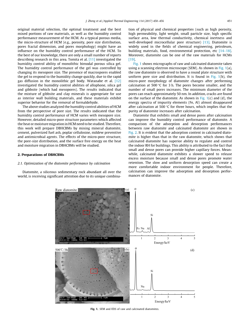 图1.原始和煅烧硅藻土的SEM和EDS。
