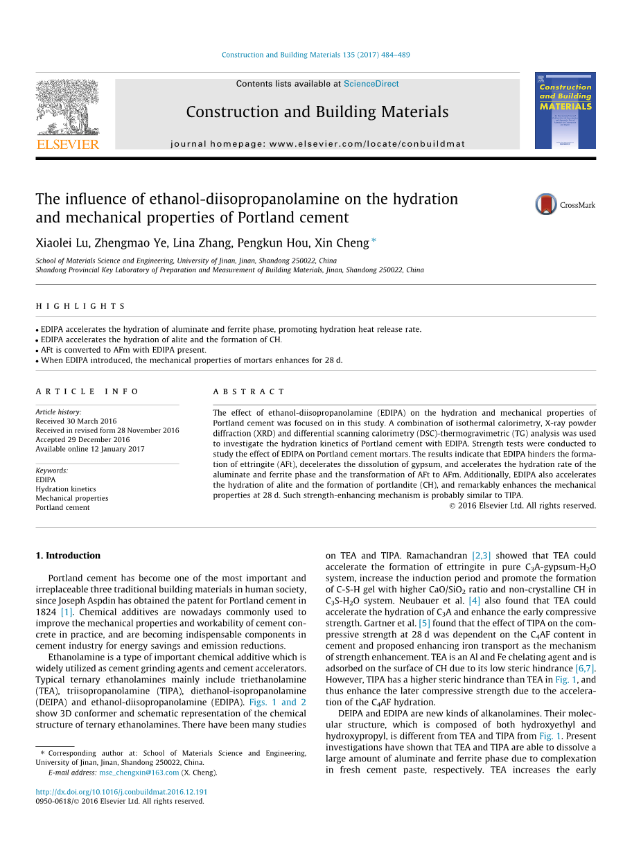 单乙醇二异丙醇胺(EDIPA) 水化动力学 机械性能 波特兰水泥