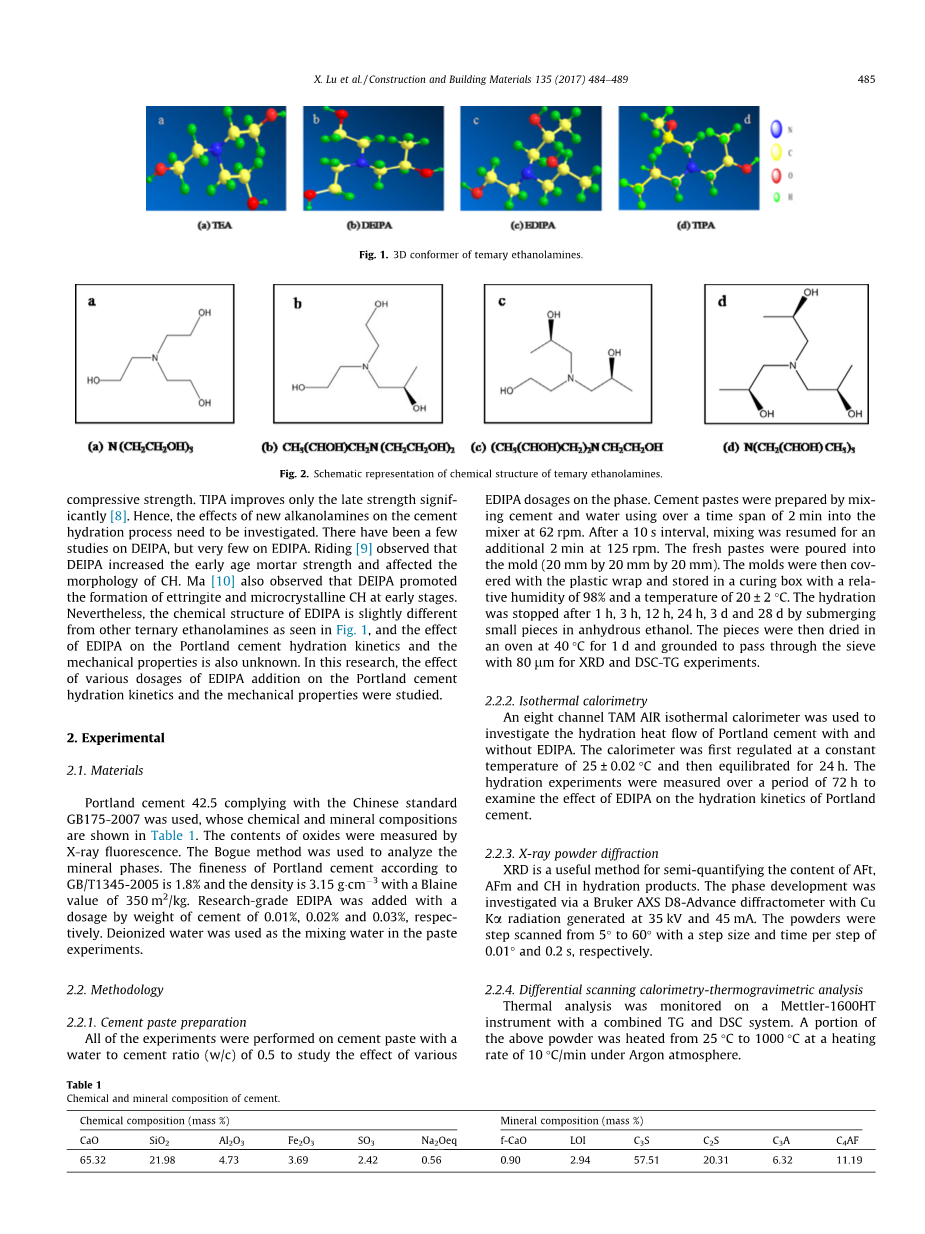 二乙醇单异丙醇胺(DEIPA)和单乙醇二异丙醇胺(EDIPA)是醇胺类化合物的新种类。从图1来看,它们的分子结构都是由羟乙基和羟丙基组成,但是又不同于三乙醇胺(TEA)和三异丙醇胺(TIPA)。目前的研究表明,由于新拌水泥浆体中的络合作用,TEA和TIPA分别能够溶解大量的铝和铁素体相。TEA可以提高早期抗压强度,TIPA仅仅是在提高后期强度的作用上明显一些。因此,新的链烷醇胺在水泥水化过程中的影响还需要研究。目前已经有一定数量的研究是针对DEIPA的,但很少有研究是针对EDIPA的。Riding观察到,DEIPA会增加早期砂浆的强度并影响氢氧化钙(CH)的形态。Ma也观察到,DEIPA可以促进早期阶段钙矾石和微晶氢氧化钙(CH)的形成。然而,从图1看,EDIPA的化学结构与其他乙醇胺类化合物的略有不同,并且EDIPA对波特兰水泥的水化动力学和力学性能的影响是未知的。在本文中,主要研究分别加入不同剂量的EDIPA对波特兰水泥水化动力学和力学性能的影响。