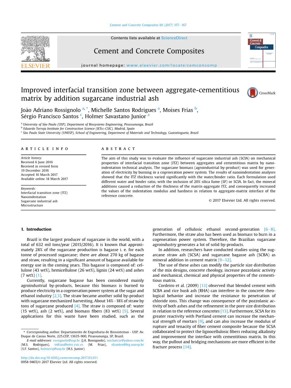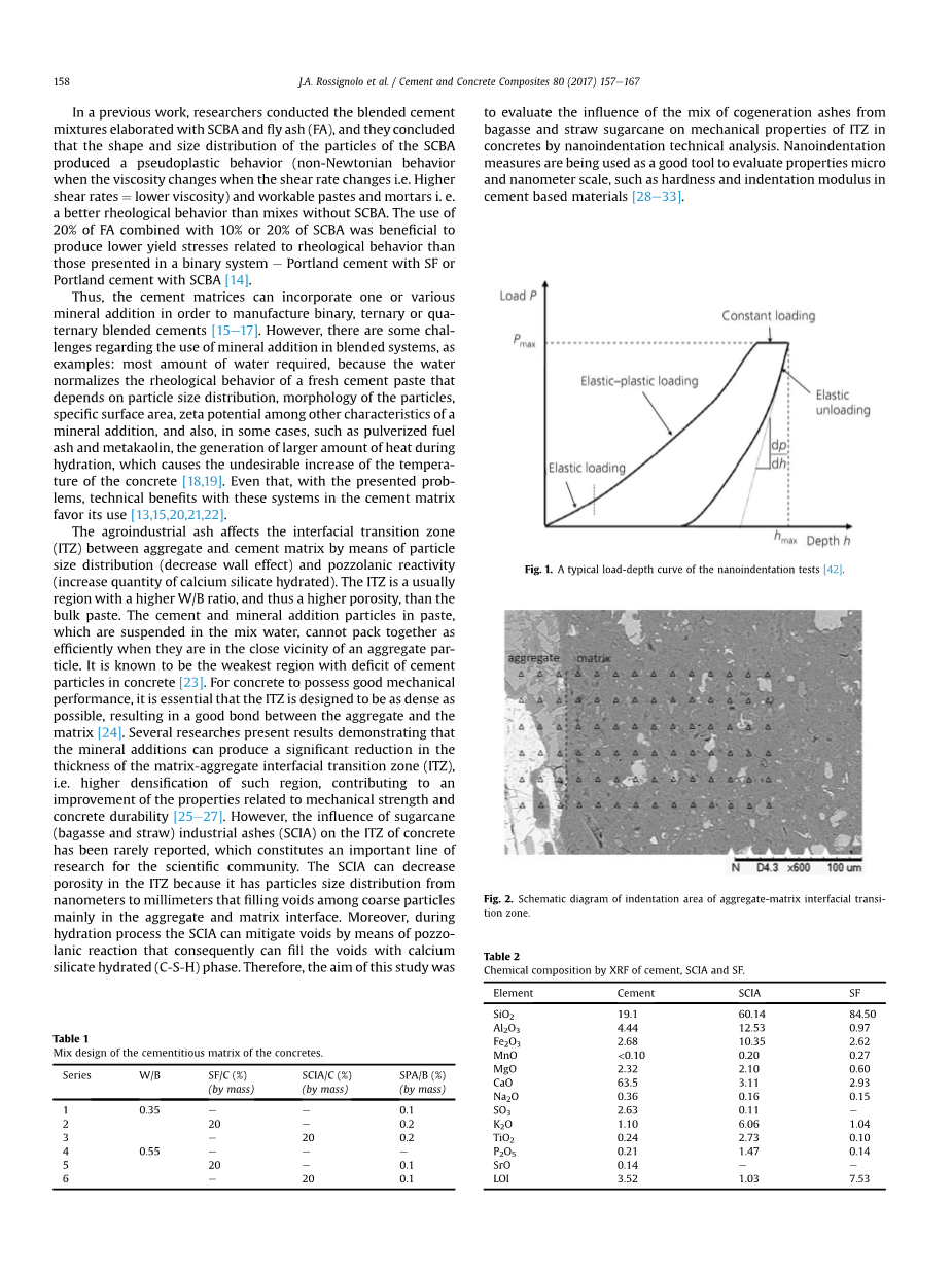 工农业灰烬通过粒度分布(降低壁效应)和火山灰反应性(增加水化硅酸钙的量)影响骨料和水泥基体之间的界面过渡区(ITZ)。ITZ通常是具有较高W / B比的区域,因此其孔隙率高于水泥石。在混合水中悬浮的水泥和矿物添加颗粒,当它们在聚集的微粒附近时,不能有效地聚集在一起。已知它是混凝土中水泥颗粒不足的最薄弱区域。对于具有良好机械性能的混凝土来说,ITZ必须尽可能致密,使骨料和基体之间形成良好的结合。一些研究结果表明,矿物添加剂可以显著降低基体 - 骨料界面过渡区(ITZ)的厚度,即该区域有更高的致密度,有助于改善机械强度和混凝土耐久性相关性能。然而,甘蔗(甘蔗渣和秸秆)工业灰烬(SCIA)对混凝土ITZ的影响很少有报道,这是科学界的重要研究方向。SCIA可以降低ITZ的孔隙率,因为它具有从纳米到毫米的颗粒尺寸分布,可以填充主要位于骨料和基体界面中的粗颗粒之间的空隙。而且,在水化过程中,SCIA可以通过火山灰反应生成水化硅酸钙(C-S-H)相填充空隙来减少空隙。因此,本研究的目的是通过纳米压痕技术分析来评估甘蔗渣和甘蔗秸秆热电联产的灰分对混凝土ITZ力学性能的影响。纳米压痕测量正被用作评估微米和纳米尺度性能的好工具,如水泥基材料的硬度和压痕模量。