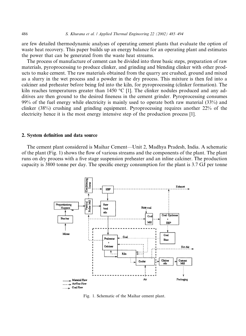 摘要:水泥行业是一个能量密集型行业,每生产一吨水泥大约需要4GJ的热量。利用排放的废气余热进行余热发电的热力学分析是不太容易的。现在也少有关于这方面的研究。基于此背景,本文系统地研究了印度一个年产1Mt水泥的水泥厂生产系统的能量平衡情况。根据在这个工厂所获取的数据绘制了桑基能量平衡图。研究发现,大约有35% 的输入水泥生产系统的总能量都随废热气流的排放而被浪费掉了。同时该工厂通过一个蒸汽循环系统,利用废热回收蒸汽发电机从蒸汽中回收热量进行余热发电。该水泥工厂的余热发电系统大约产生了4.4兆瓦的电力,这些发电量满足该水泥工厂大约30%的电力需求,并且提高了工厂10%的一次能量利用效率。