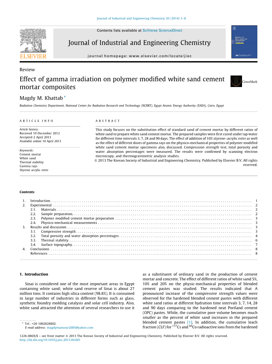 自从近50年前引入这项技术以来,材料辐射加工的实际应用一直在涉及。 伽玛辐射在治疗过程中引起交联和降解,但其中一种效应可能在某些材料中占优势。交联是聚合物辐照最重要的效果,因为它通常是伴随着辐射剂量作用下聚合物链数量的增加,导致形成网状结构。几项研究表明,在辐射聚合过程中硅酸钙之间的相互作用于混合水泥水合反应过程中形成的水合物和存在于孔隙中的聚合物中发生。因此,增强的相间粘合导致提高了机械强度、所执行部件的热和化学环境性能、可加工性、磨损、粘合强度、与基材的粘合性,或者砂浆和混凝土的防水性能发生。本工作的目的是研究用白砂、苯乙烯 - 丙烯酸酯和不同剂量的gamma;-射线辐照部分替代标准砂对复合材料的物理 - 力学性能的影响。