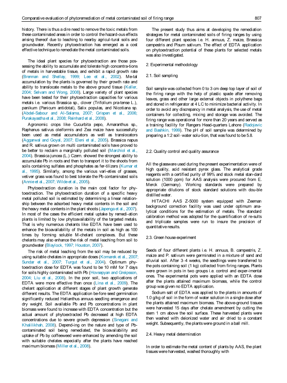 四种不同植物即向日葵, 油菜, 玉米和豌豆的种子在沙和冲积土的混合物中萌发。3-4周后,将幼苗转移到含有从靶场收集来的土壤(1kg)的盆中。植物在两个盆中生长,即对照组和实验组。在植物达到最大生物量后,实验组用EDTA剂量施用,而对照组不施用EDTA。