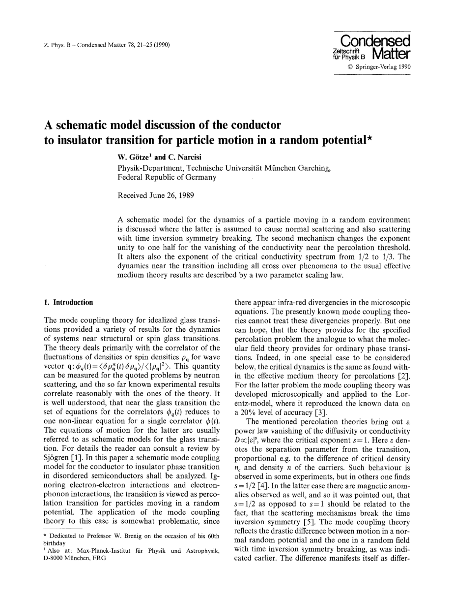 理想的玻璃转换的模式耦合理论,为结构或是自旋玻璃转换附近的系统的动力学提供了各种各样结果。该理论主要可以处理密度或自旋密度波动的相关因子为波矢量。我们发现,可以通过中子散射来测量所引用问题的这种量度,并且迄今已知的实验结果与理论的结果是合理相关的。很好理解的是,在玻璃化转变的附近,可以将相关器的方程组简化为单个相关器的一个非线性方程后者的运动方程通常被我们称为玻璃转变的示意模型。如果想要获得有关的详细信息,读者可以参考Sjouml;gren的评论[1]。在本文中,主要应该分析无序半导体中的导体到绝缘体相变的示意模式耦合模型。当忽略电子 - 电子相互作用和电子声子相互作用的时候,过渡被认为是随机电位移动粒子的渗流转变。模式耦合理论在这种情况下的应用存在一些问题,因为在微观方程中出现了红外分歧。但是,目前已知的模式耦合理论不能适当地处理这些差异。但人们可以认为,该理论为特定的渗流问题提供了类似于分子场理论为普通相变提供了依据。事实上,在下面要考虑的一个特例中,关键是动力学与有效介质理论中的渗流相同[2]。关于后一个问题,模式耦合理论是在微观上开发出来的,并且应用于Lor-entz模型,它在20%的准确度水平上再现了已经获得的数据[3]。