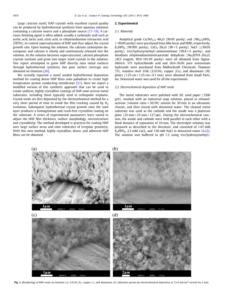 我们最近研究了通过新型种晶水热沉积法将致密的HAP薄膜涂覆在钯上以形成高温质子传导膜。本文研究了在几种金属基材(包括通常用于整形外科植入物的基材)上用此法产生均匀的,高度结晶的HAP涂层。首先通过电化学方法在非常短的时间内沉积晶种,以避免由H2析出引起的薄膜开裂。随后在晶种层上生长的水热晶体在衬底上产生均匀且无裂缝的晶体涂层。通过改变一系列实验参数来调节HAP膜厚度,表面形态,微观结构和结晶度。所研发的方法适用于在大表面积和不规则几何形状的衬底上涂覆HAP。采用这种新方法可以获得高度结晶,致密且粘附的HAP膜。