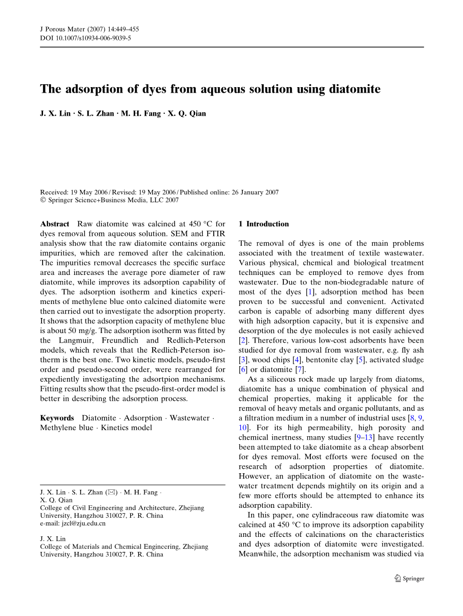 摘要:生硅藻土在450℃煅烧后去除水溶液中所含的染料。扫描电镜和红外光谱分析表明,原硅藻土含有有机物杂质,煅烧后能够除去。杂质去除降低了比表面积。增加原料的平均孔径硅藻土,同时提高了它的吸附能力染料。焙烧硅藻土对亚甲基蓝的吸附等温线和动力学实验并对吸附性能进行了研究。表明亚甲基蓝的吸附能力吸附等温线约为50毫克/克。Langmuir, Freundlich and Redlich-Peterson模型,揭示了Redlich Peterson等温式是最好的一个。两个动力学模型,伪第一顺序和伪二阶,重新安排方便调查吸附机制。拟合结果表明,伪一阶模型能更好地描述吸附过程。
