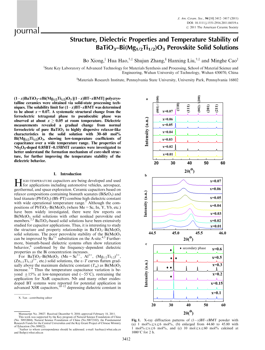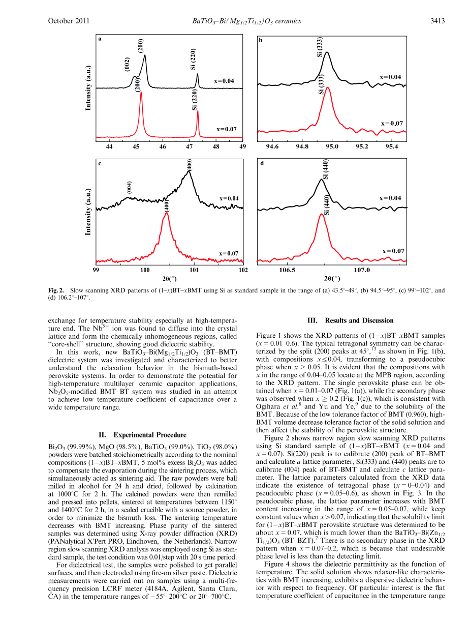 虽然PbTiO3-Bi(Me)O3的组成(其中Me=Sc,In,Y,Yb等)已被广泛研究,但与其他非铅钙钛矿端元件有关的Bi(Me)O3固溶体的报道却很少。因此,研究BaTiO3-Bi(Me)O3固溶体的结构和性质关系是非常有趣的Bi(Me)O3的较差的钙钛矿稳定性可以通过在A位上Ba2 取代来改善。此外,铋基介电体系通常表现出松弛行为,由Bi浓度增加时频率相关的介电性质所证实。