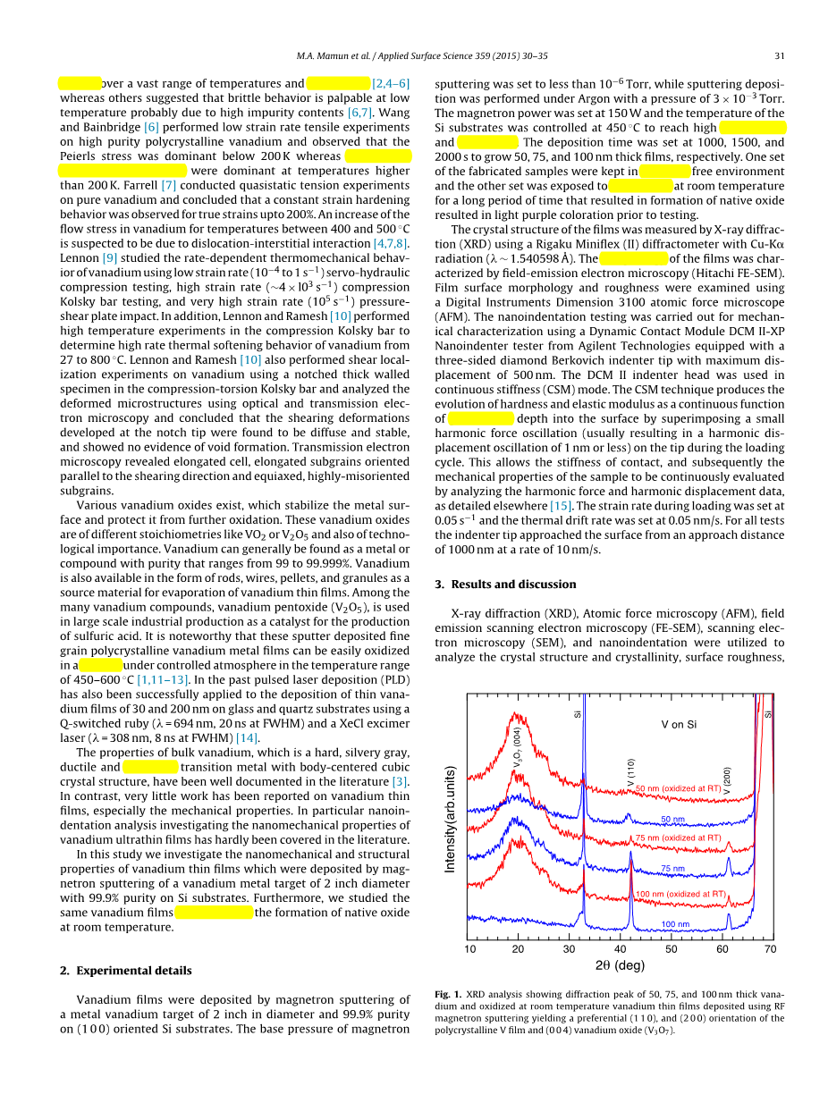 通过磁控溅射在(100)取向的Si衬底上直径为2英寸和99.9%纯度的金属钒靶沉积钒膜。磁控溅射的基础压力设定为不小于10-6托,在氩气气压为3*10-3托时进行溅射沉积。磁控管功率设置为150W,Si衬底的温度控制在450℃,以达到高结晶度和均匀性。沉积时间设定为1000秒,1500秒和2000秒,分别生长50纳米,75纳米和100纳米厚的膜。一组制作的样品维持在无水环境中,而另一组样品放置在环境空气中,将样品长时间维持在室温条件下,导致天然氧化物的形成在测试之前被染成浅紫色。利用一台Rigaku Miniflex (II)铜Kalpha;射线衍射仪(波长约为1.540598埃)用X射线衍射测量薄膜的晶体结构。通过场发射电子显微镜(Hitachi FE-SEM)表征膜的形态,用一台数码仪器尺寸3100的原子力显微镜来测试薄膜的表面形貌和粗糙度。使用Agilent Technologies的动态接触模块DCM II-XP Nanoindenter测试器进行纳米压痕测试以进行机械表征,这个测试器配备有最大位移为500纳米的三面金刚石Berkovich压头。DCM II压头使用连续刚度模式,CSM技术作为穿透深度进入表面的连续函数,在装载循环周期通过叠加小谐波力振荡在尖端产生硬度和弹性模量的演变(通常会导致小于等于1纳米的谐波位移震荡)。这个演变允许出现接触刚度,随后像其它地方所详细描述那样通过分析谐波力和谐波位移数据连续评估样品的机械性能。在装载期间的应变速率设定为0.05/s,热漂移率设定为0.05纳米/s。对于所有测试,压头以10纳米 / s的速率从1000纳米的接近距离接近表面。