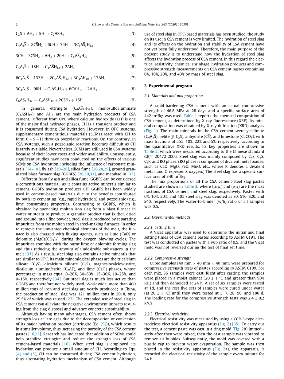 一般来说,钙矾石(C6A3H32)、单硫铝酸盐(C4AH12)和铝胶是CSA水泥的主要水化产物。与OPC不同,OPC中氢氧化钙(CH)是主要的最终水合相之一,而在CSA水泥水化过程中,CH是一种过渡产物,在CSA水合过程中被消耗。然而,在OPC系统中,辅助胶凝材料(SCMs)通过火山灰反应与CH反应生成C-S-H凝胶。相反,在CSA系统中,由于CH很少可用,这种火山灰反应变得困难。尽管如此,SCMs由于其较低的成本和更广泛的可用性,仍然在CSA系统中使用。因此,我们对各种SCMs对CSA水化的影响进行了重要的研究,包括碳酸盐矿物[14–18]、粉煤灰[19–28]、硅灰[26,28,29]、磨细高炉矿渣(GGBFS)[26,30,31]和偏高岭土[32]的影响。不同于粉煤灰和硅灰,GGBFS可被视为一种胶凝材料,因为它含有类似于水泥的活性矿物。GGBFS水化产生CH。GGBFS由于其胶结(例如,快速水化)和火山灰(例如,石灰消耗)特性所带来的益处而被广泛应用于水泥基材料中。GGBFS是将高炉的铁水渣在水或蒸汽中淬火,生成颗粒状产品,然后干燥并磨成细粉,而GGBFS则是通过在炼钢炉中将钢液中的杂质分离而产生的。为了去除熔体中不需要的化学元素,在吹氧循环过程中,毛皮还加入助熔剂,如石灰(CaO)或白云石(MgCa(CO3)2)。杂质与生石灰或白云石结合形成炉渣,从而减少了熔体中不需要的物质的数量[33]。因此,钢渣中还含有类似OPC的活性矿物。其主要矿物相为硅酸三钙(C3S)、硅酸二钙(C2S)、镁钙矾石、铁铝酸二钙(C2AF)和石灰(CaO),其质量百分比分别为0–20%、30–60%、15–30%、10–25%和0–15%[34]。但钢渣的活性远不如GGBFS,因此没有得到广泛的应用。全世界每年生产的钢铁渣超过4亿吨;中国2018年的钢渣产量为1.21亿吨,其中只有29.5%的钢渣被再利用[27]。钢渣在CSA水泥中的推广应用,可以减轻钢渣处理对环境的负面影响,提高混凝土的耐久性、可持续性。尽管CSA水泥有许多优点,经常显示出后期强度损失是由于其主要水化产物(钙矾石(等式(9))的分解或转化,导致体积变小,从而增加CSA水泥浆体的孔隙率[16,23]。研究表明,添加SCMs有助于稳定钙矾石,降低CSA水泥基材料的强度损失[16]。采用钢渣时,其水化可产生少量CH,根据式(4)和式(5),在CSA水泥水化过程中,CH被消耗,从而改变了CSA水泥的水化机理。虽然钢渣在OPC基材料中的应用已有研究,但其在CSA水泥中的应用研究却十分有限。钢渣的水化及其对CSA水泥水化和稳定性的影响尚不完全清楚。因此,本研究的主要目的是了解钢渣水化对CSA水泥水化过程的影响,即对含0%、10%、20%和40%钢渣的CSA水泥浆体的电阻率、化学收缩率、水化产物和抗压强度进行测定。