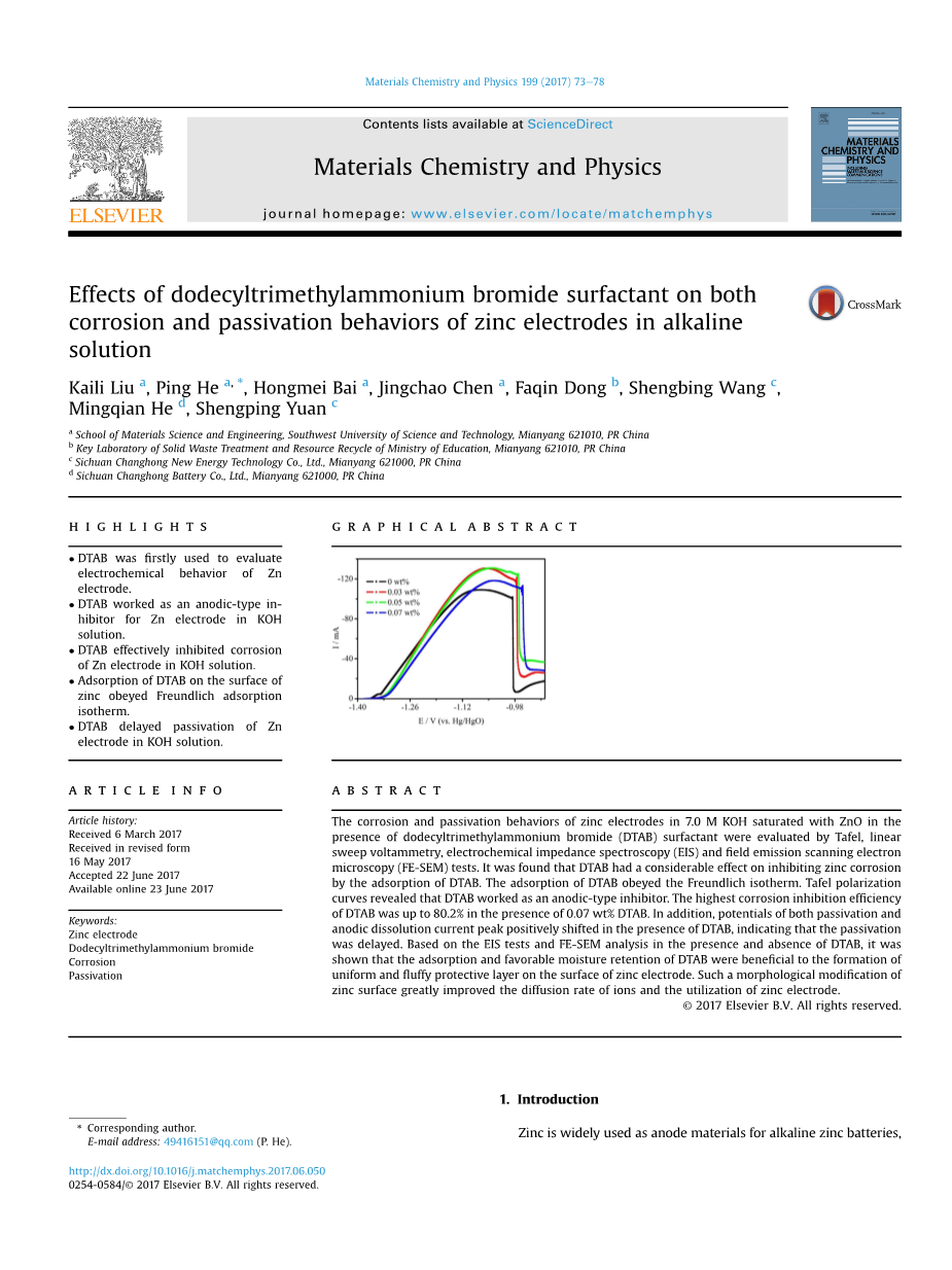 关键词:锌电极 十二烷基三甲基溴化铵 腐蚀 钝化