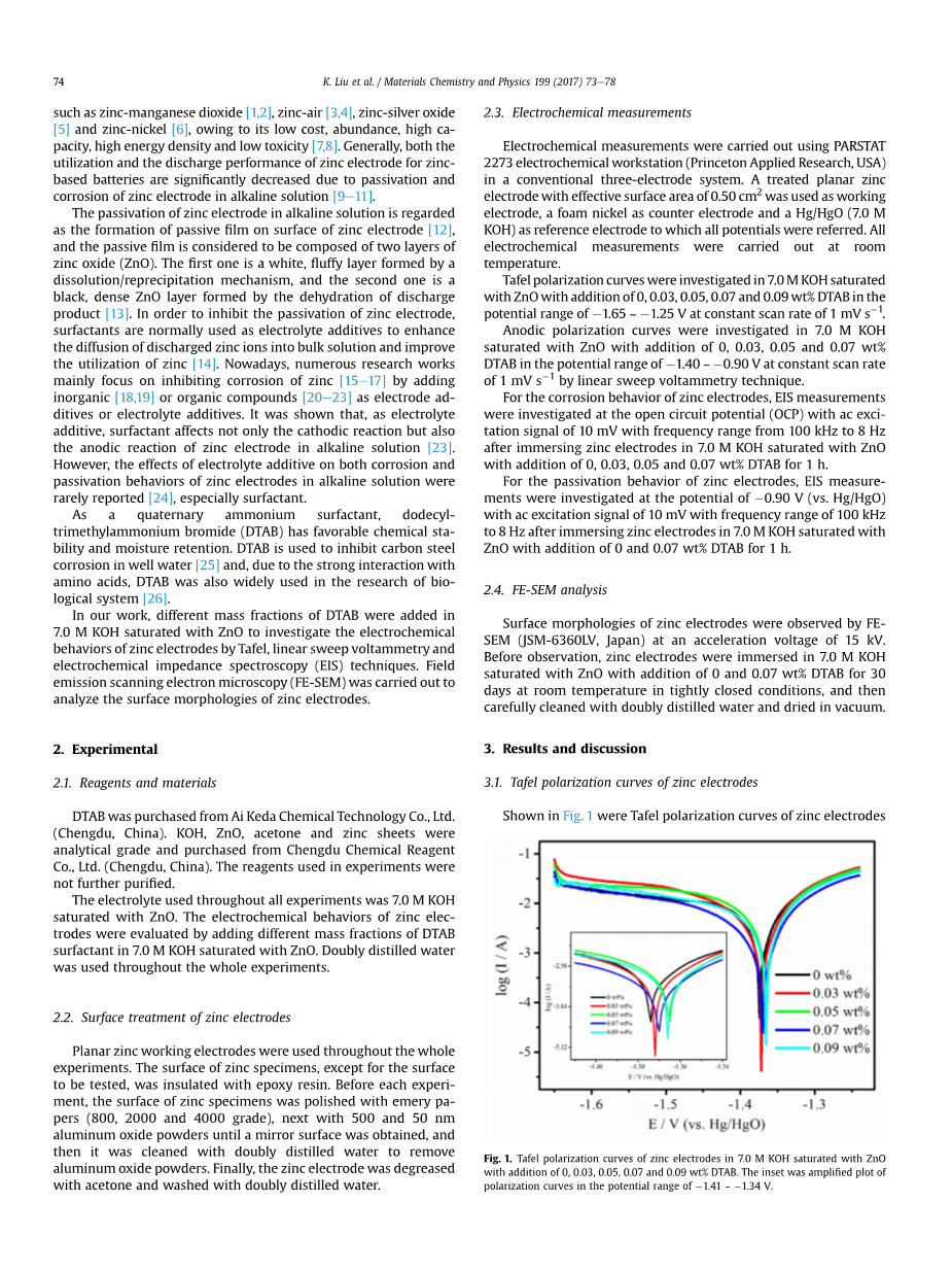 图1.浸泡在加入0、0.03、0.05、0.07和0.09wt%的DTAB的7.0 M KOH饱和ZnO电解液中的锌电极的Tafel极化曲线。插图为在-1.41〜-1.34 V电位范围内的极化曲线。