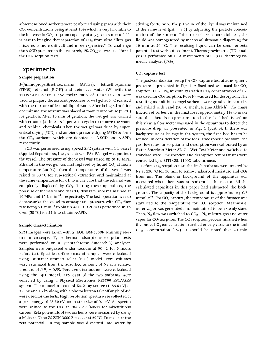以3-(氨基丙基)三乙氧基硅烷(APTES)、四乙氧基硅烷(TEOS)、乙醇(Etoh)和去离子水(W)为原料,以TEOS:APTES:Etoh:W摩尔比为1:4:13.7:8,在冰水和液态水的混合作用下,制备了0℃的吸附剂前驱体或湿凝胶。Er搅拌1分钟后,将混合物置于室温下(20℃)进行凝胶化。在凝胶化10 min后,用乙醇(3次/次,每次8h)清洗湿凝胶,去除水和残留化学物质。然后用超临界干燥(SCD)和常压干燥(APD)对湿凝胶进行干燥,形成分别表示为A-SCD和A-APD的CO2吸附剂。SCD是使用SPE-ed SFE系统与1L血管(应用分离,公司,艾伦敦,PA)进行的.湿凝胶被放入容器中。该容器的压力高达10 MPa。在室温(20℃)下,用液体CO2代替湿凝胶中的乙醇。然后将超临界萃取的温度提高到50℃,并在相同温度下维持4h,以确保乙醇被CO2完全置换。在这些操作中,容器的压力和CO2的低速率保持在10 mpa和15 L min。最后一次操作是将容器减压至大气压,CO2低速率为5 L min。1获得A-SCD。APD在烤箱(50℃)中进行24h,得到AAPD.