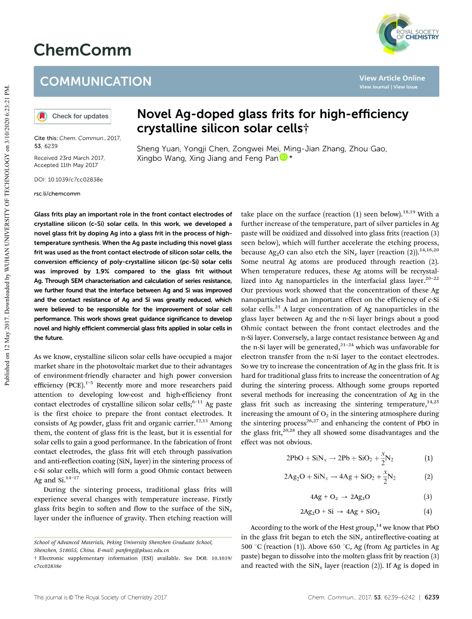 发生在表面(反应(1)见下文)[18,19]。随着温度的进一步升高,银浆中的部分银颗粒将被氧化并溶解到玻璃熔块中(反应(3)见下文),这将进一步加速蚀刻过程,因为Ag2O也可以蚀刻SiNx层(反应(2))[14,16,20]。一些中性银原子是通过反应(2)产生的。当温度降低时,这些银原子将在界面玻璃层中再结晶成银纳米粒子[20–22]。我们先前的工作表明,这些银纳米粒子的浓度对c-Si太阳电池的效率有重要影响[21]。在Ag和n-Si层在前接触电极和n-Si层之间形成良好的欧姆接触。相反,Ag与n-Si层之间会产生较大的接触电阻[21-24],不利于电子从n-Si层转移到接触电极。所以我们试图提高玻璃熔块中的银浓度。传统的玻璃熔块在烧结过程中很难提高银的含量。尽管一些研究小组报道了几种提高玻璃料中Ag浓度的方法,如提高烧结温度[14,25]、在烧结过程中增加烧结气氛中的O2含量[26,27]和提高玻璃料中PbO的含量[20,28]例均表现出一定的缺陷,效果不明显。