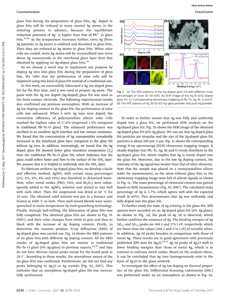 图2(a)不同银质量百分比(0–10 wt%)的掺银玻璃熔块的DSC曲线。(b) c-Si晶片Ag-3d的XPS谱