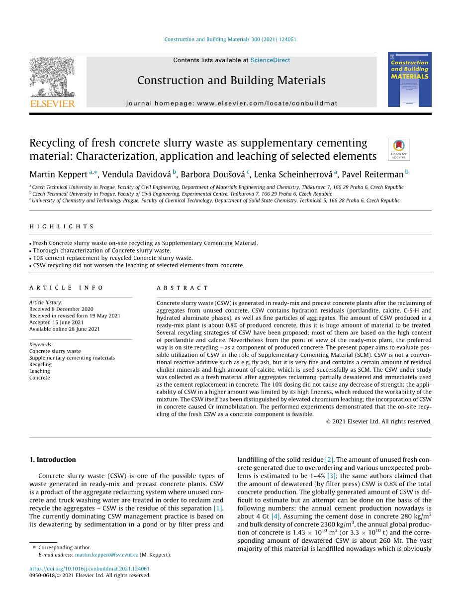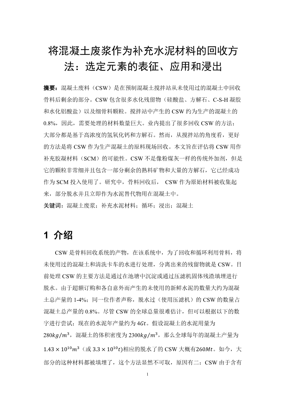 将混凝土废浆作为补充水泥材料的回收方法:选定元素的表征、应用和浸出外文翻译资料