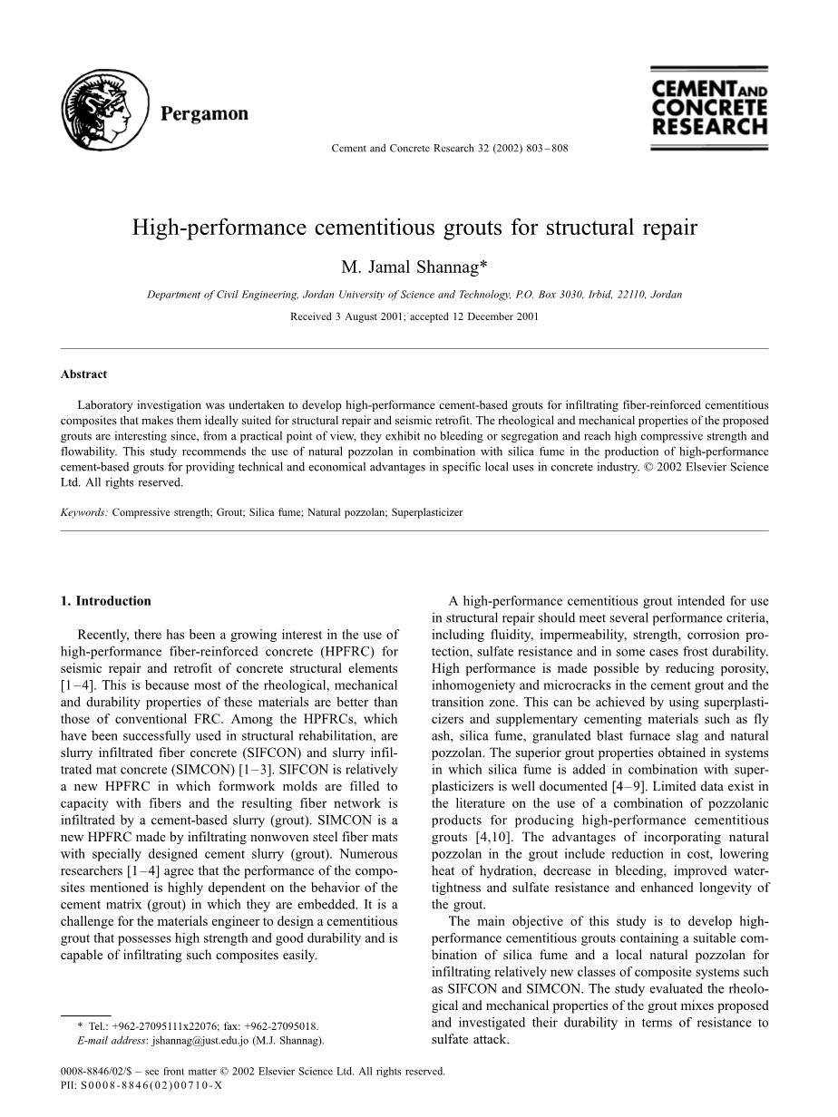 用于结构修复的高性能水泥浆应满足若干性能标准,包括流动性,不渗透性,强度,腐蚀保护,抗硫酸盐性和某些情况下的抗冻性。通过降低水泥浆和过渡区的孔隙率,不均匀性和微裂纹,从而达到高性能的效果。这可以通过使用超增塑剂和辅助胶结材料来实现,例如粉煤灰,硅粉,粒状高炉矿渣和天然火山灰。在硅粉加入超级增塑剂的系统中获得的优异的水泥浆性能已得到充分证明。[4-9]关于使用火山灰产品组合生产高性能水泥浆的文献中存在有限的数据。在灌浆中加入天然火山灰的优点包括降低成本,降低水化热,减少渗色,改善水密性和抗硫酸盐性,并延长灌浆的使用寿命。这项研究的主要目的是开发高性能水泥浆,其中含有适当的硅粉和局部天然火山灰组合,用于渗透相对较新的复合系统,如SIFCON和SIMCON。 该研究评估了所提出的灌浆混合物的流变性和机械性能,并研究了它们在抗硫酸盐侵蚀方面的耐久性。
