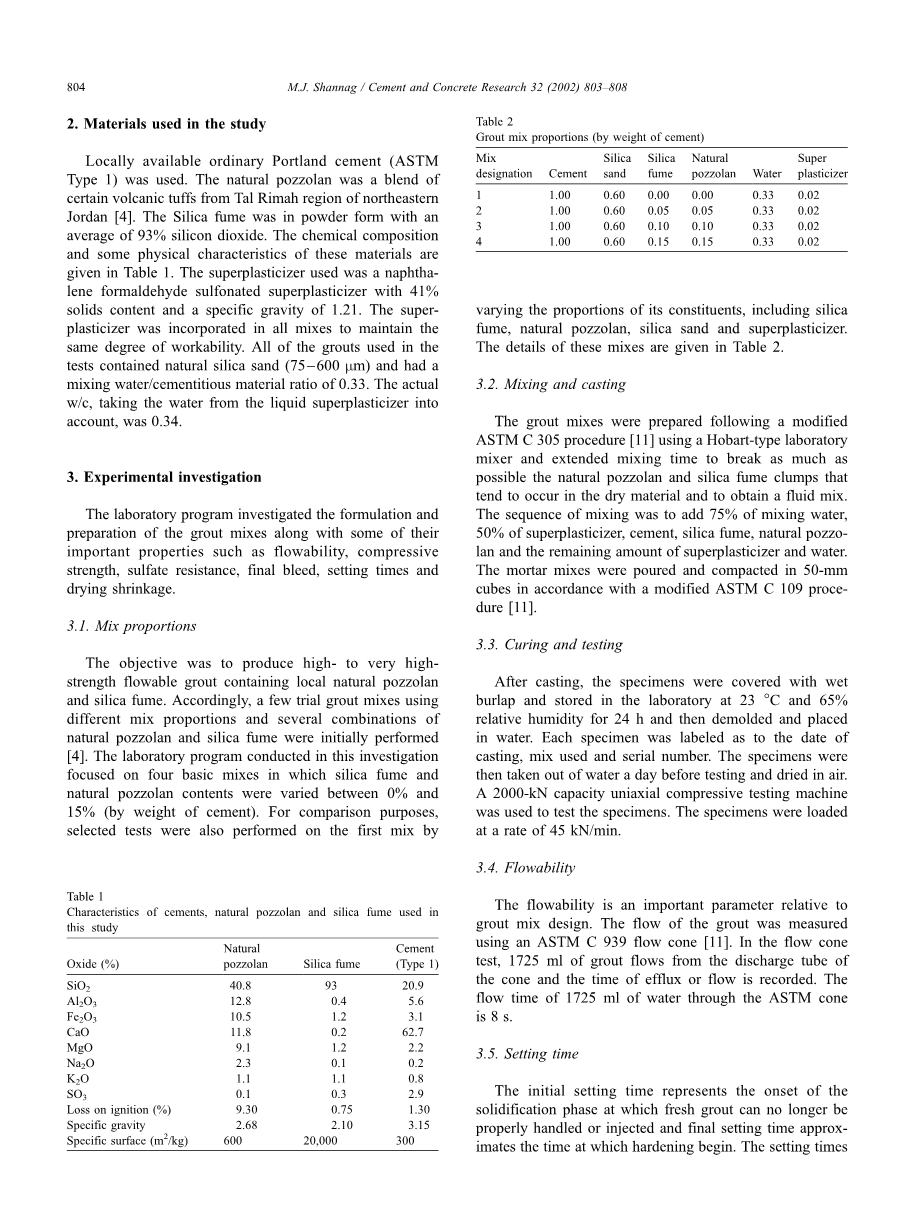 本次实验的目的是生产含有局部天然火山灰和硅粉的高强度和高强度可流动灌浆。 因此,最初进行了一些使用不同混合比例和几种天然火山灰和硅粉组合的试验灌浆混合物。[4]在该调查中进行的实验室程序集中在四种基本混合物中,其中硅灰和天然火山灰含量在0%和15%之间变化(以水泥的重量计)。 为了进行比较,还通过改变其组分的比例对第一混合物进行了选择的测试,包括硅粉,天然火山灰,硅砂和超塑化剂。 这些混合物的细节在表2中给出。