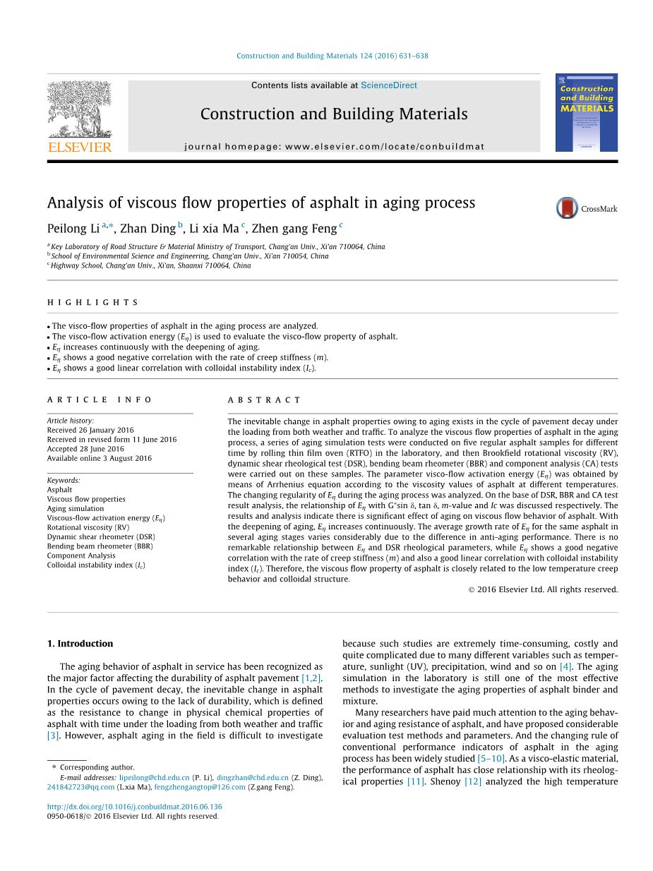 研究沥青的老化行为和机理对指导沥青混凝土的再循环具有实际意义。在这项研究中,沥青在老化过程中的粘性流动性是通过实验室测试研究的。 Arrhenius方程用于获得粘流激活能(Eeta;),以从热力学和流变学的角度分析老化对沥青粘性流动性的影响。该作者讨论了Eeta;的变化规律以及在沥青老化过程中Eeta;与流变和结构参数如G* sindelta;,tandelta;,m和Ic之间的关系。