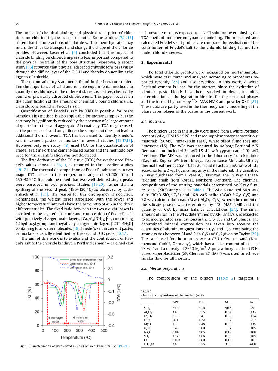 XRD定量分析净浆中的Friedel盐含量是可行的,该方法同样可用于砂浆的分析,但由于沙子中存在石英,精度会显著下降。作为代替,TGA也是可行的,因为沙子只是稀释了样品,并没有引入额外的热效应。在许多研究中TGA被用来鉴别水泥净浆或砂浆中Friedel盐[12,17,18]。然而,只有一项研 究[18]用TGA对硅酸盐水泥基净浆中的Friedel盐进行了定量分析,定量的方法并没有交代。