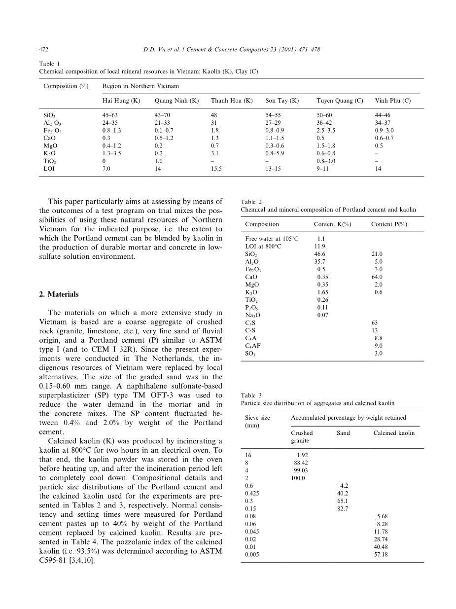 就目前而言,可以使用到的本地资源,如富含氧化铝的粘土和高岭土,在越南北部的许多地区是丰富和广泛的。表1对越南北部的这种矿物资源作了有限的调查。因此,本次研究着重于研究高岭土在砂浆和混凝土生产中取代波特兰水泥的程度。问题的关键在于开发掺有高岭土的混凝土在低浓度硫酸钠溶液中的抗压强度和耐久性的潜力。掺有高岭土混合浆料的砂浆和混凝土的强度试验早有报道。关于高岭土作为一种合适的火山灰材料的特性的更多细节,读者可以参考这些出版物[3],[4],[10]。有关耐久性方面更详细的报告以及挠曲试验和更浓的硫酸盐溶液环境侵蚀养护,请参见[10]。这些试验在越南仍在继续,尤其是在混凝土方面。这项调查的结果将在之后加以综述。