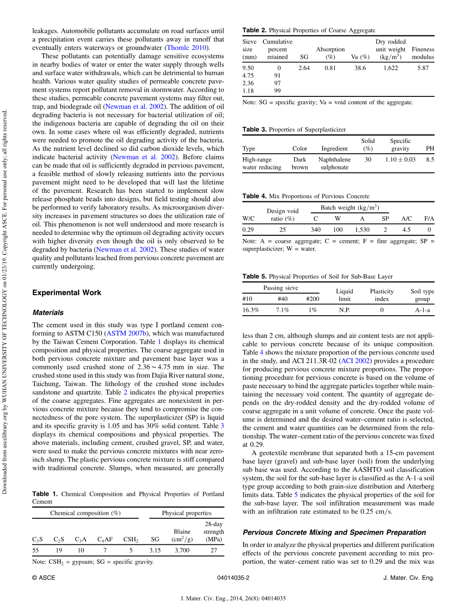 这些污染物会潜在地破坏水体附近敏感的生态系统或者通过井和表面回收水进入供水系统中,而这些是和人类健康息息相关的。 关于透水混凝土路面的水质的大量研究表明,其中的污染物被去除掉了。根据这些调查,透水混凝土路面或许可以过滤、吸收或者降解机油(Newman et al. 2002)。因此不需要再加入机油降解微生物;它们自身所带的微生物便具有降解机油的能力。随着机油的降解,那些营养素也会同时加快机油的降解。随着营养浓度的降低,二氧化碳的浓度也会降低,这在一定程度上也体现了微生物的活跃程度 (Newman et al. 2002)。在透水混凝土可以有效降解机油的研究被证实之前,一种可行的方法是缓慢地向路面渗透营养素直到它使用寿命结束,不过这种方法需要去完善和发展。可以向配方设计中加入磷酸珠,然后通过测试来看看它的效果是否达到预期。随着道路结构中的微生物多样性的增长,机油的利用率也会随之增长。 这种现象不是很容易理解,因此需要更多的研究来解释为什么在机油只能被细菌分解的情况下,随着微生物的多样性的增加,机油的降解会更好(Newman et al. 2002).。下面的实验便是关于透水混凝土路面对于水质以及污染物过滤的研究。