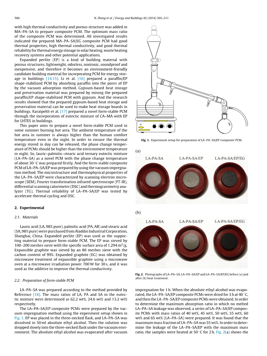 本文旨在制备一种用于某些夏季燃烧热区的新型稳定型PCM。即使在夜晚,夏季炎热地区的环境温度也始终高于人体舒适温度。为了确保白天储存的热能可以释放,PCM的相变温度应该高于夜间的环境温度。因此,首先制备了月桂酸-棕榈酸-硬脂酸三元低共熔物(LA-PA-SA)作为新型PCM,相变温度约为30℃。采用真空浸渍法制备了LA-PA-SA/EP的形态稳定的复合PCM。通过扫描电子显微镜(SEM),傅里叶变换红外光谱仪(FT-IR),差示扫描量热仪(DSC)和热重分析仪(TG)对LA-PA-SA/EP的微观结构和热物理性质进行了表征。通过加速热循环和DSC测试LA-PA-SA/EP的热可靠性。