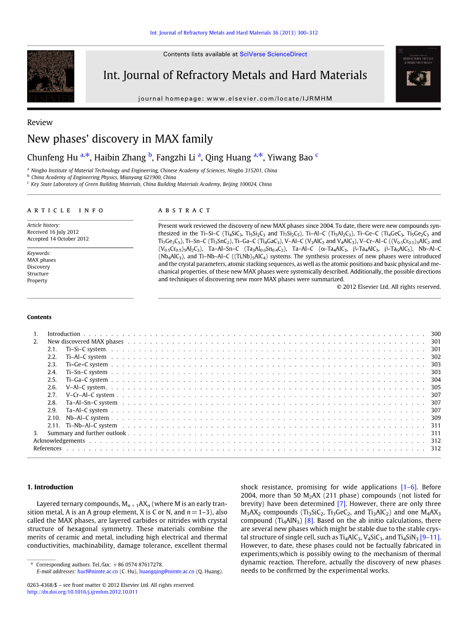 层状三元化合物,Mn 1AXn(其中M是早期过渡金属,A是A族元素,X是C或N,n = 1-3),也称为MAX相,是层状碳化物或氮化物,晶体结构为六边形对称。这些材料结合了陶瓷和金属的优点,包括高导电性和导热性,可加工性,耐损伤性,优异的抗热冲击性,有望广泛应用[1-6]。在2004年之前,已经确定了超过50种M2AX(211相)化合物(简称未列出)[7]。然而,只有三种M3AX2化合物(Ti3SiC2,Ti3GeC2和Ti3AlC2)和一种M4AX3化合物(Ti4AlN3)[8]。基于ab initio计算,由于单个电池的稳定晶体结构,如Ti4AlC3,V4SiC3和Ti4SiN3 [9-11],有几个新的相可能是稳定的。但是,迄今为止,这些阶段不可能是事实上是在实验中制造的,这可能是由于热动力学反应的机理。因此,实际上需要通过实验工作来确认新阶段的发现。