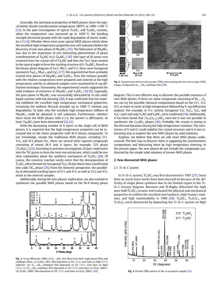 在Ti-Si-C体系中,Ti3SiC2最早于1967年被发现[27]。由于Ti-Si-C三元图中的有限区域,由于单相合成的困难,因此没有更多的工作被关注。 Barsoum和El-Raghy制造了高纯度的Ti3SiC2陶瓷,并评估了其物理和机械性能,以确认1996年出色的低硬度,高杨氏模量和高机械加工性[28]。通过在MgO(111)和Al2O3(0001)衬底上沉积Ti-Si-C系统,发现了Ti4SiC3,Ti5Si2C3和Ti7Si2C5 [29]。通常,Ti5Si2C3和Ti7Si2C5可以被认为是每个A层之间2和3或3和4个Mlayers的共生。图1显示了沉积的Tin 1SiCn多层膜的XRD图案。显然,已经确定了Ti4SiC3,Ti5Si2C3和Ti7Si2C5的衍射峰。此外,通过TEM和SEM研究,横截面层的图像显示了312,725和413结构的10个硅层。在TEM图像中,匹配的原子位置和堆叠序列表明硅层形成镜面(图2)。