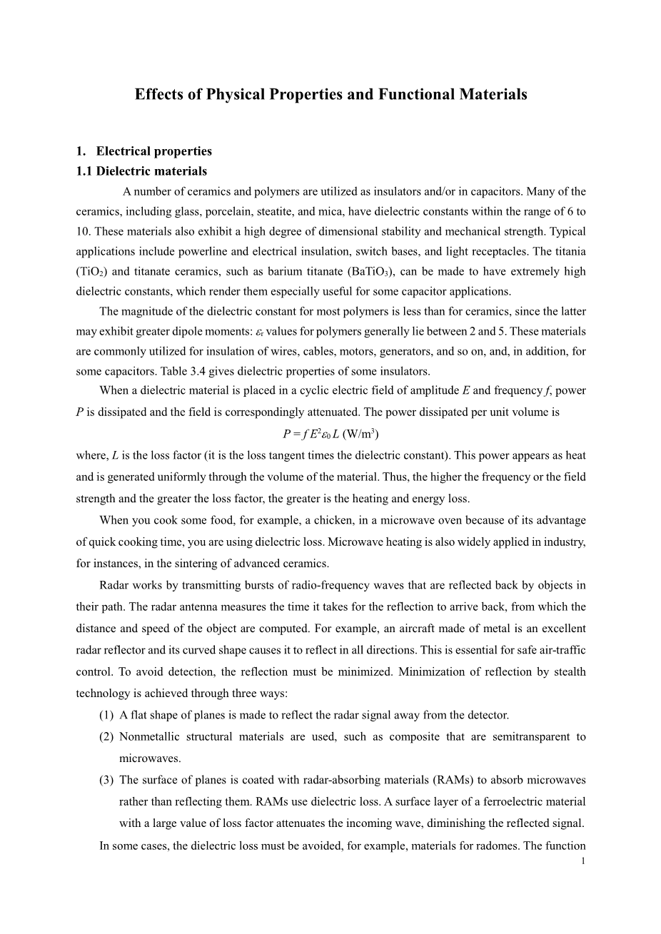 大多数聚合物的介电常数的大小小于陶瓷,因为后者可能表现出更大的偶极矩:聚合物的介电常数值一般在2到5之间。这些材料通常用于电线、电缆、电机、发电机等的绝缘,此外,还用于一些电容器。表3.4给出了部分绝缘子的介电性能。