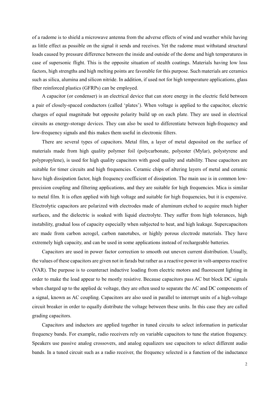 这些材料在相对较低的外加电场频率下具有极高的介电常数。钛酸钡(BaTiO3)就是这样一种材料,它存在于它的四方晶体结构中。在这个结构中它也是压电的。铁电材料制成的电容器由于介电常数高,因而体积小得多。也有需要介电常数较低(le;3) 的材料用于涂料、薄膜、矩阵树脂,纤维,特别是在电子工业和航空航天工业。现在已经研制出一种低介电常数的聚酰亚胺纤维,可能用于印刷电路板和飞机复合材料。这种纤维具有与标准纺织纤维相似的高热稳定性和良好的拉伸性能。