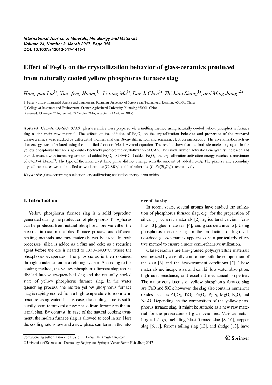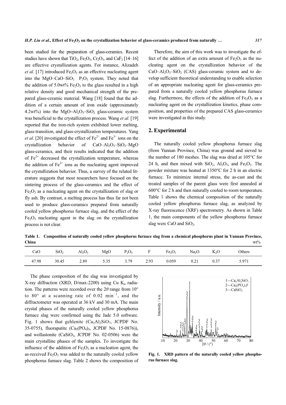 微晶玻璃是通过仔细控制炉渣的组成[6]和热处理条件[7]合成的细粒多晶材料。这些材料便宜并且具有低吸水性,高耐酸性和优异的机械性能。黄磷炉渣的主要成分是CaO和SiO2;除此之外,炉渣中还含有大量的氧化物,如Al2O3,TiO2,Fe2O3,P2O5,MgO,K2O和Na2O。根据黄磷炉渣的组成,它可能适合作为制备微晶玻璃的新原料。各种冶金炉渣,包括高炉矿渣[8-10],铜渣[6,11],含铁尾矿渣[12]和污泥[13],已经被研究用于制备微晶玻璃。 最新的研究表明,TiO2,Fe2O3,Cr2O3和CaF2 [14-16]是有效的晶核剂。例如,Alizadeh等人[17]将Fe2O3作为有效的成核剂引入到MgO-CaO-SiO2-P2O5体系中。文章中指出,向玻璃中添加5.0wt%的Fe2O3会使所制备的微晶玻璃材料具有较高的相对密度和良好的机械强度。王教授等人[18]发现在MgO-Al2O3-SiO2微晶玻璃体系中加入一定量的氧化铁(约4.2wt%)有利于该体系微晶玻璃的析晶过程。王教授等人[19]报道,富铁系统的微晶玻璃会表现出较低的熔化温度,玻璃化转变温度和玻璃结晶温度。杨教授等人[20]研究了Fe2 和Fe3 离子对CaO-Al2O3-SiO2-MgO微晶玻璃结晶行为的影响,结果表明添加Fe2 降低了结晶温度而添加Fe3 离子可作为成核剂改善了该系统微晶玻璃的析晶行为。因此,根据对相关文献的调查表明,大多数研究人员关注的是微晶玻璃的烧结过程以及Fe2O3作为成核剂对炉渣或粉煤灰结晶的影响。相比之下,迄今为止还没有使用熔融工艺来生产由自然冷却的黄磷炉渣制备的微晶玻璃,并且炉渣中的Fe2O3成核剂对微晶玻璃析晶过程的影响尚不清楚。