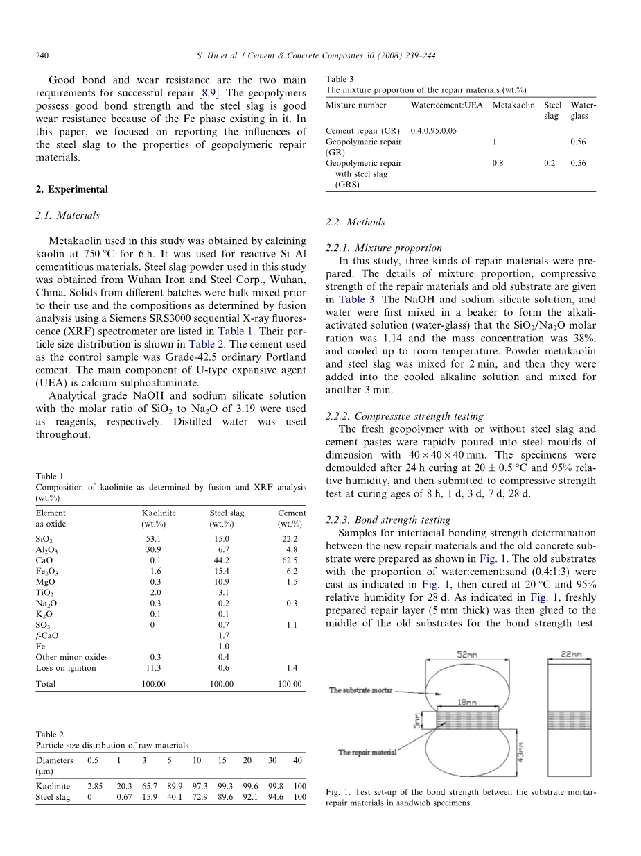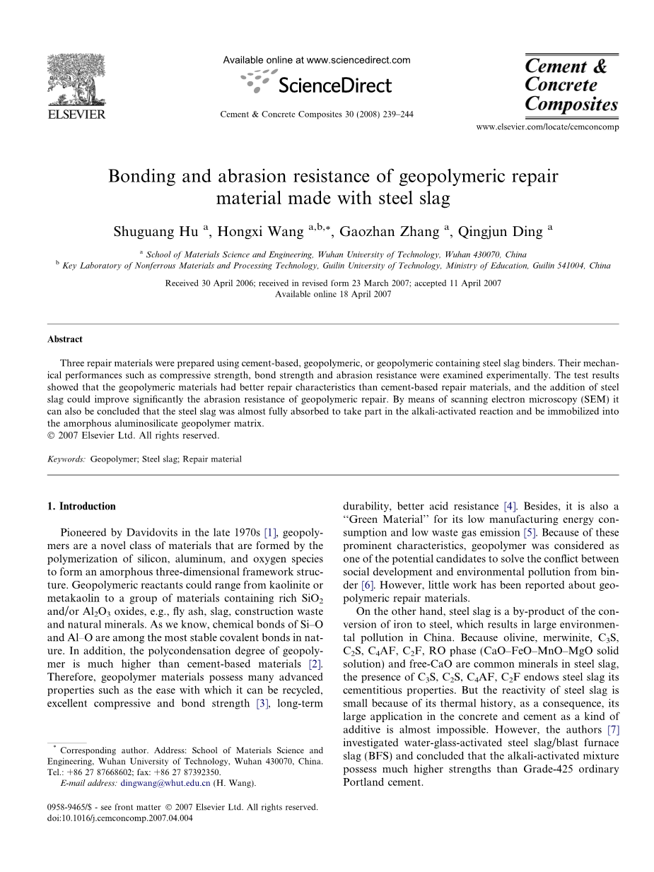 掺加钢渣的地聚合物修补材料的粘结性和耐磨性外文翻译资料