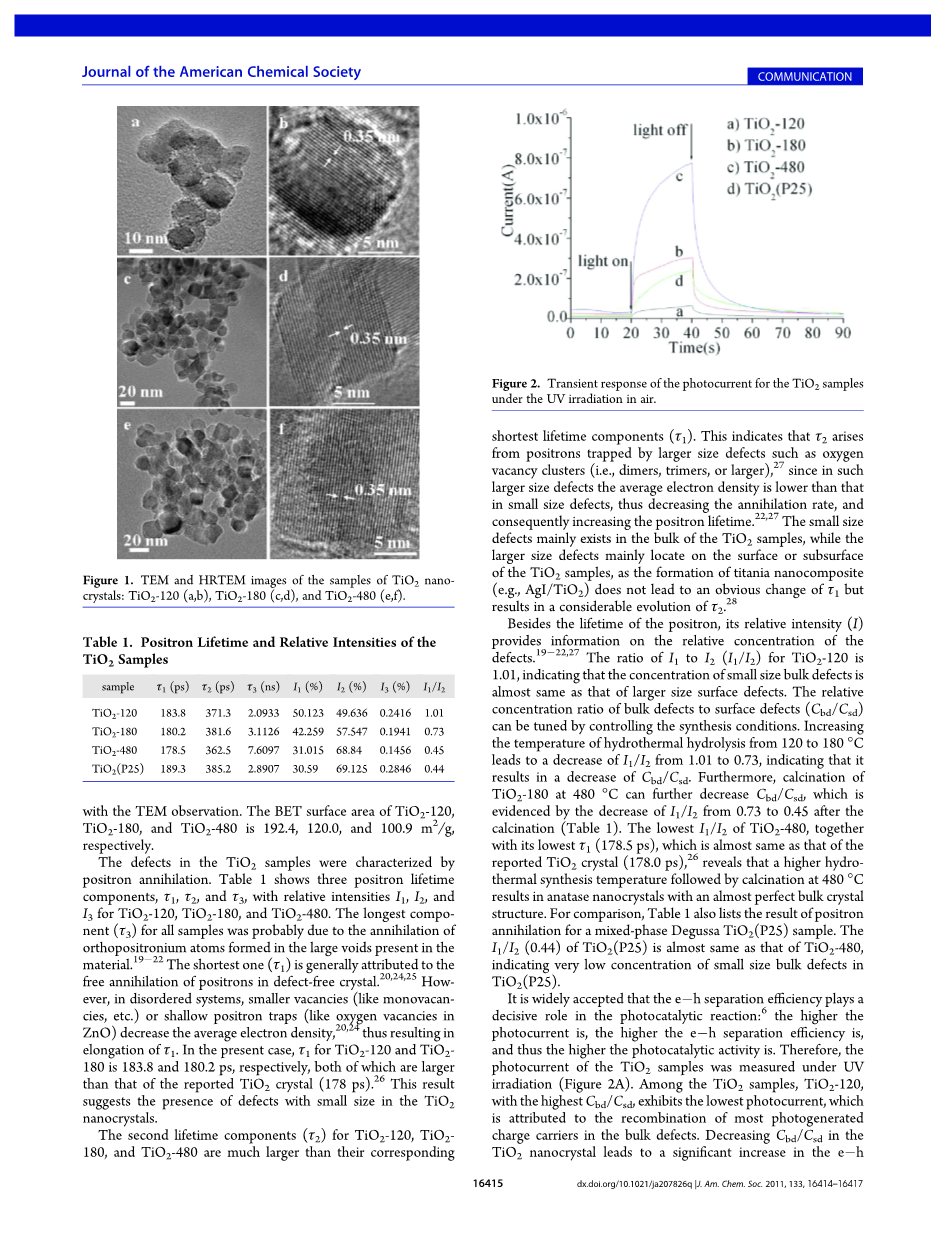 众所周知,混合相TiO2(P25)显示出更高的电子与空穴分离效率;因此,由于光生电子从金红石相转移到锐钛矿相,它比单独的纯相显示出更高的光催化活性。令人惊讶的是,TiO2(P25)显示出比TiO2 -480低得多的电子与空穴分离率,观察到的光电流最大值后者比前者高3.3倍。正电子湮没表征表明TiO2(P25)的Cbd / Csd几乎与TiO2 -480(表1)相同。然而,由于在TiO2 -(P25)中金红石和锐钛矿纳米颗粒之间的界面处存在的应变,在扭曲的界面区域中存在电子俘获位点。目前工作中的正电子湮灭证实了TiO2(P25)中存在界面缺陷,因为其tau;1(189.3 ps)大于TiO2 -120(183.8 ps)的tau;1,TiO2 -180(180.2 ps)和TiO2 -480(178.5ps)(表1)。然而,正电子湮灭不能区分界面缺陷和TiO2(P25)中的体缺陷。界面电子 - 陷阱可以作为复合中心,与具有完美块状晶体结构的纯锐钛矿纳米晶体相比,导致电子分离效率降低。(例如,TiO2 -480)。