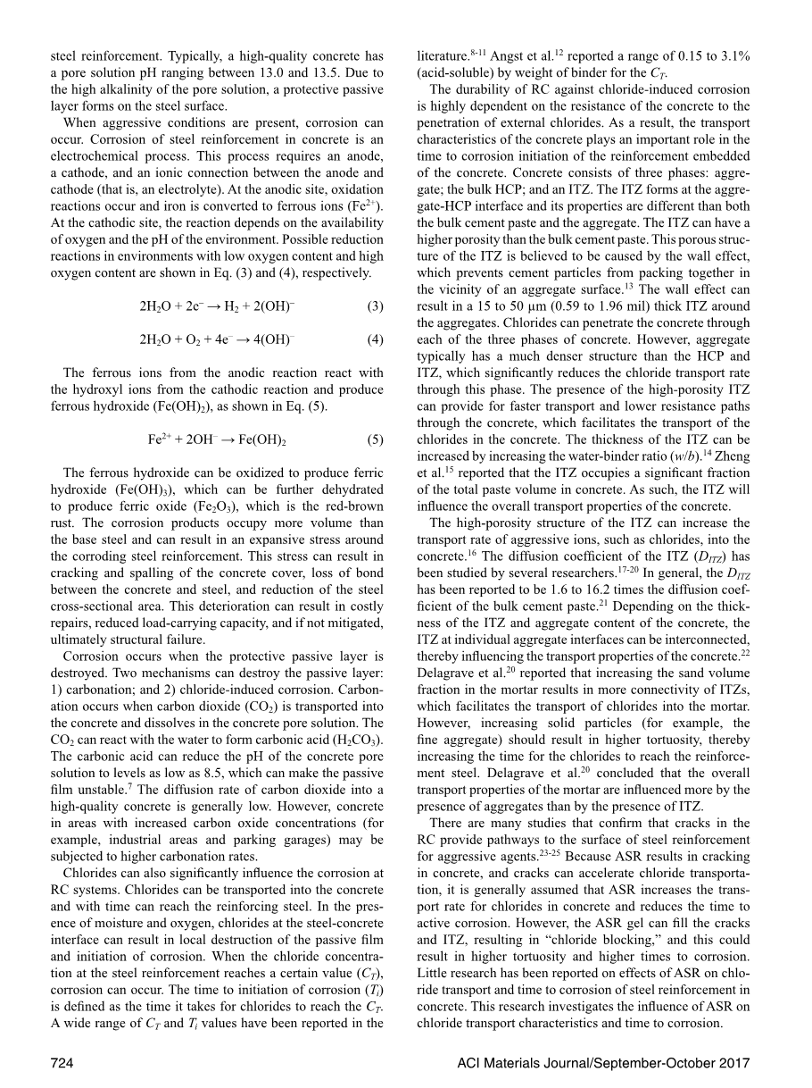 有许多研究证实RC中的裂纹为侵蚀剂提供了通往钢筋表面的途径。23-25由于ASR会导致混凝土开裂,并且裂纹会加速氯化物的运输,因此通常认为ASR可以提高混凝土中氯化物的运输速度并减少发生主动腐蚀的时间。但是,ASR凝胶可以填充裂缝和ITZ,从而导致“氯化物阻塞”,这可能导致较高的曲折度和较长的腐蚀时间。关于ASR对氯化物传输和混凝土中钢筋腐蚀时间的影响的研究很少。 这项研究调查了ASR对氯化物传输特性和腐蚀时间的影响。