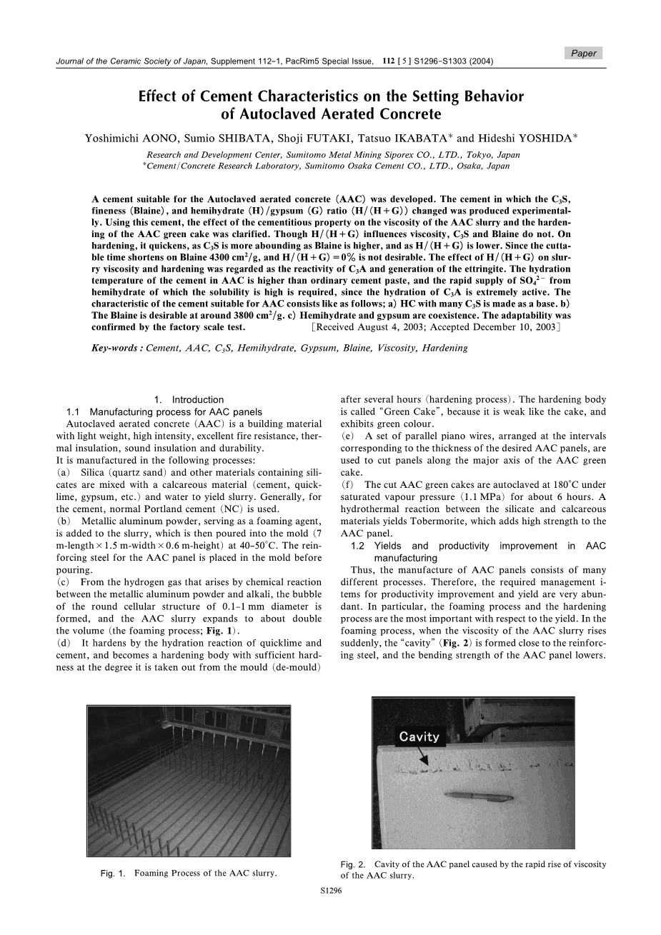 本实验开发了一种可搭配高压加气混凝土(AAC)的水泥。实验得到了一种水泥,其C3S,细度和半水合物(H)/石膏(G)比(H /(H G))有所不同。利用该水泥,明确了水泥性质对AAC泥浆的粘度和AAC青饼的硬化作用的影响。H /(H G)影响粘度,但是C3S和细度没有任何影响。随着C3S增多,细度提高,H /(H G)降低,硬化速度加快。因为细度为4300 cm2 / g,H /(H G)= 0%时,切割时间缩短,这是不理想的状况。将H /(H G)对浆液粘度和硬化的影响视作C3A的反应性和钙矾石的产生。AAC中水泥的水合温度高于普通水泥浆,并且需要从溶解度高的半水合物中快速抽取SO2-,因为C3A的水合作用非常活跃。适用于AAC的水泥的特点如下: a)充满大量C3S的HC作为基底。 b)约3800cm2 / g 的细度是理想的条件 c)半水合物和石膏共存。工厂规模测试证实了其适应性。