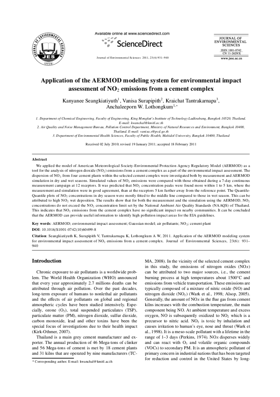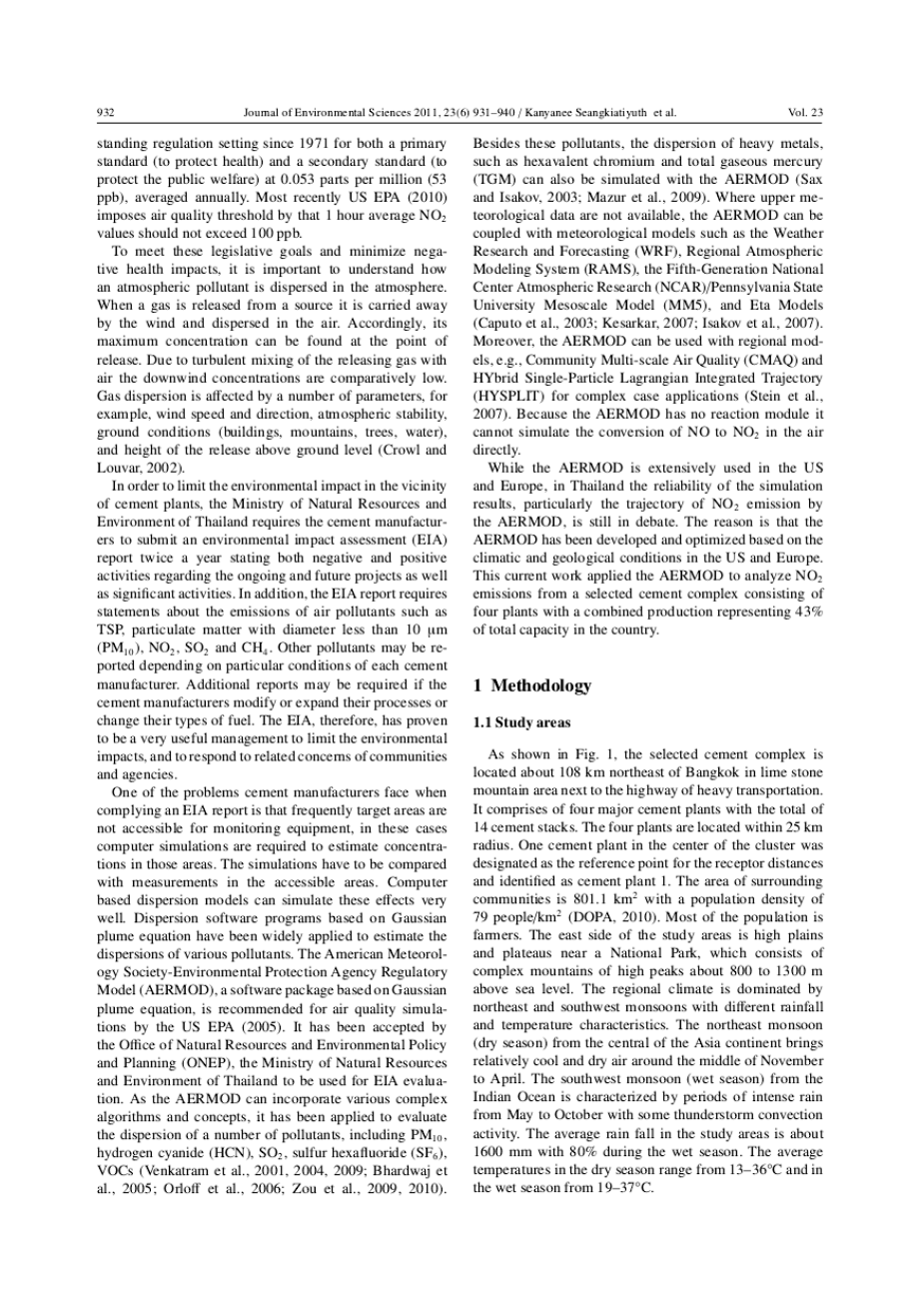 长期暴露于空气的污染物是一个世界性的问题。世界卫生组织(WHO)宣布, 每年大约270万计的死亡是由于通过空气污染。在过去的几十年中,人类对非致命性空气污染物的长期暴露以及空气污染物对全球和区域大气循环的影响进行了深入研究。由于健康影响,特别是臭氧(O3)、总悬浮颗粒物(TSP)、可吸入颗粒物(PM)、二氧化氮、二氧化硫、一氧化碳、铅和其他毒素成为调查重点(Kirk-Othmer, 2007)。泰国是主要的灰水泥生产商和出口商。通过主要的九个制造商的18个水泥厂和31日窑,每年的产量可达46兆吨水泥熟料和56兆吨水泥(TC-MA,2008)。在这个研究中选定的水泥复合体附近,氮氧化物(氮氧化物)的排放量可以归因于两个主要的来源: 水泥在高温下约1500摄氏度灼烧和汽车运输的排放。这些排放通常由一氧化氮(NO)的混合物和二氧化氮(NO2) (Wark et al., 1998; Alsop, 2005)。一般来说,水泥窑烟气中的氮氧化物含量随着燃烧温度的增加而增加,主要成分是NO。在环境温度和过量的氧气的情况下,被氧化为NO2,这是硝酸的前体NO2吸入是有毒的,会刺激人类的眼睛,鼻子(Wark et al., 1998) 这是有效期的中污染物的1 3天范围 (Perkins,1974)。氮氧化物广泛分散,反应与O3和挥发性有机化合物(挥发性有机化合物的仪器)产生的二次颗粒物。自1971年以来,主要关心的是大气污染物在工业国家有针对性的减少和控制,美国通过长期监管设置为主要标准(保护健康)和二级标准(保护公益)0.053 ppm(53每年平均含量)。美国环保署(2010)对空气质量阈值的1小时平均NO2值不应超过100 ppb。为了达到这些立法目标并减少对健康的负面影响,了解大气中的污染物是如何在大气中扩散是很重要的。当气体从源头释放出来时,它就被风带走,分散在空气中。因此,它的最大浓度可以在释放时找到。由于释放气体与空气的湍流混合,下风的浓度相对较低。气体扩散影响的参数,例如,风速和风向,大气稳定,地面条件(建筑、山、树、水),和地面高度(Crowl 和 Louvar, 2002). 为了限制环境影响附近的水泥厂,泰国的自然资源局和环境局要求水泥制造商提交环境影响评估(EIA)报告一年两次陈述正面和负面的活动关于正在进行的和未来的项目以及重大活动。此外,环评报告需要陈述的排放空气污染物TSP等颗粒物直径小于10米(PM10)、NO2、SO2和甲烷。根据不同水泥制造商的具体情况,可能会报告其他污染物。其他污染物可能根据不同水泥制造商的具体情况而报告。如果水泥制造商修改或扩大他们的工艺或改变他们的燃料类型,可能需要额外的报告。因此,EIA已被证明是一项非常有用的管理,以限制环境影响,并对社区和机构的相关担忧作出回应。在遵守环评报告时,水泥制造商面临的一个问题是,通常的目标区域不能用于监测设备,在这些情况下,需要计算机模拟来估计这些区域的浓度。模拟必须与可访问区域的测量相比较。基于计算机的离散模型可以很好地模拟这些效果。摘要基于高斯羽流方程的离散软件程序已被广泛应用于估计各种污染物的扩散。美国气象Society-Environmental保护局监管模式(AERMOD),一个软件包基于高斯分布方程,建议由美国环保署空气质量模拟(2005),已经接受的自然资源和环境政策和规划办公室(ONEP),泰国的自然资源和环境用于环境影响评估的评价。AERMOD可以把各种复杂的算法和概念,它已经应用于评估分散的污染物,包括PM10、氰化氢(HCN)、二氧化硫、六氟化硫(SF6)、挥发性有机化合物的仪器(Venkatram etal., 2001, 2004, 2009; Bhardwaj et al., 2005; Orloff et al., 2006; Zou et al., 2009, 2010)。除了这些污染物, AERMOD也可以模拟重金属的分散,如六价铬和总气态(Saxand Isakov, 2003; Mazur et al., 2009)。上层大气数据不能获取的地方,AERMOD可以加上气象模型等研究和预测天气(WRF), 区域大气建模系统(RAMS) 第五代国家大气研究中心(NCAR)及佩恩森林城州立大学MM5中尺度模式及其他模型。(Caputo et al., 2003; Kesarkar, 2007; Isakov et al., 2007)。此外,AERMOD可以用于区域模型,为复杂的应用程序集成的社区多尺度空气质量(CMAQ)和混合单粒子拉格朗日轨迹(HYSPLIT)为复杂的应用程序集成(Stein et al.,2007)。由于气模没有反应模组,所以它不能直接模拟空气中no-2的转换。